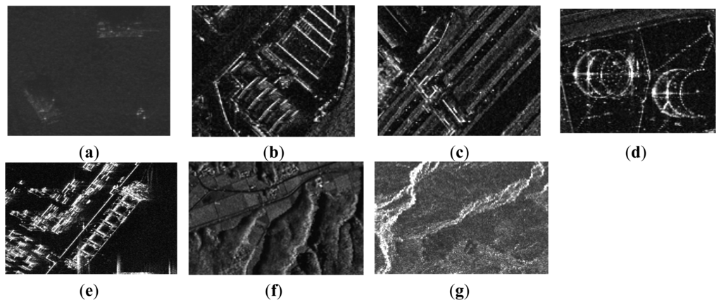 To demonstrate the universality of the proposed approach, simulations over a variety of SAR images under different sampling rates (including a low sampling mode and a high sampling mode) were carried out. More specifically, in the low sampling mode, 33% of Nyquist rate samples in range and 25% in azimuth were adopted, while in the high sampling mode, the sampling numbers in range and azimuth increased to 38% and 30%, respectively. All the other radar parameters were the same as in the first experiment. In Figure 7, we list all the SAR images.
