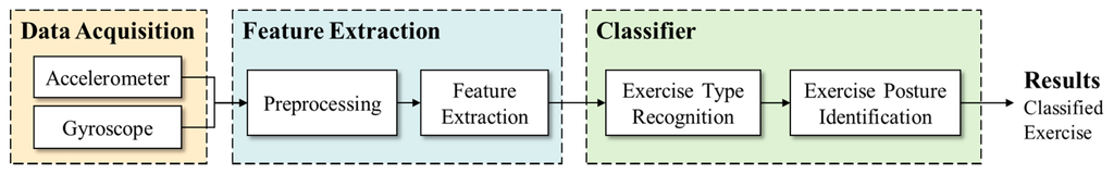 The system architecture is proposed in order to provide a reliable rehabilitation exercise assessment, as shown on Figure 1. The system consists of three main components: data acquisition, feature extraction, and classifier. The details of each are described in the following sections.