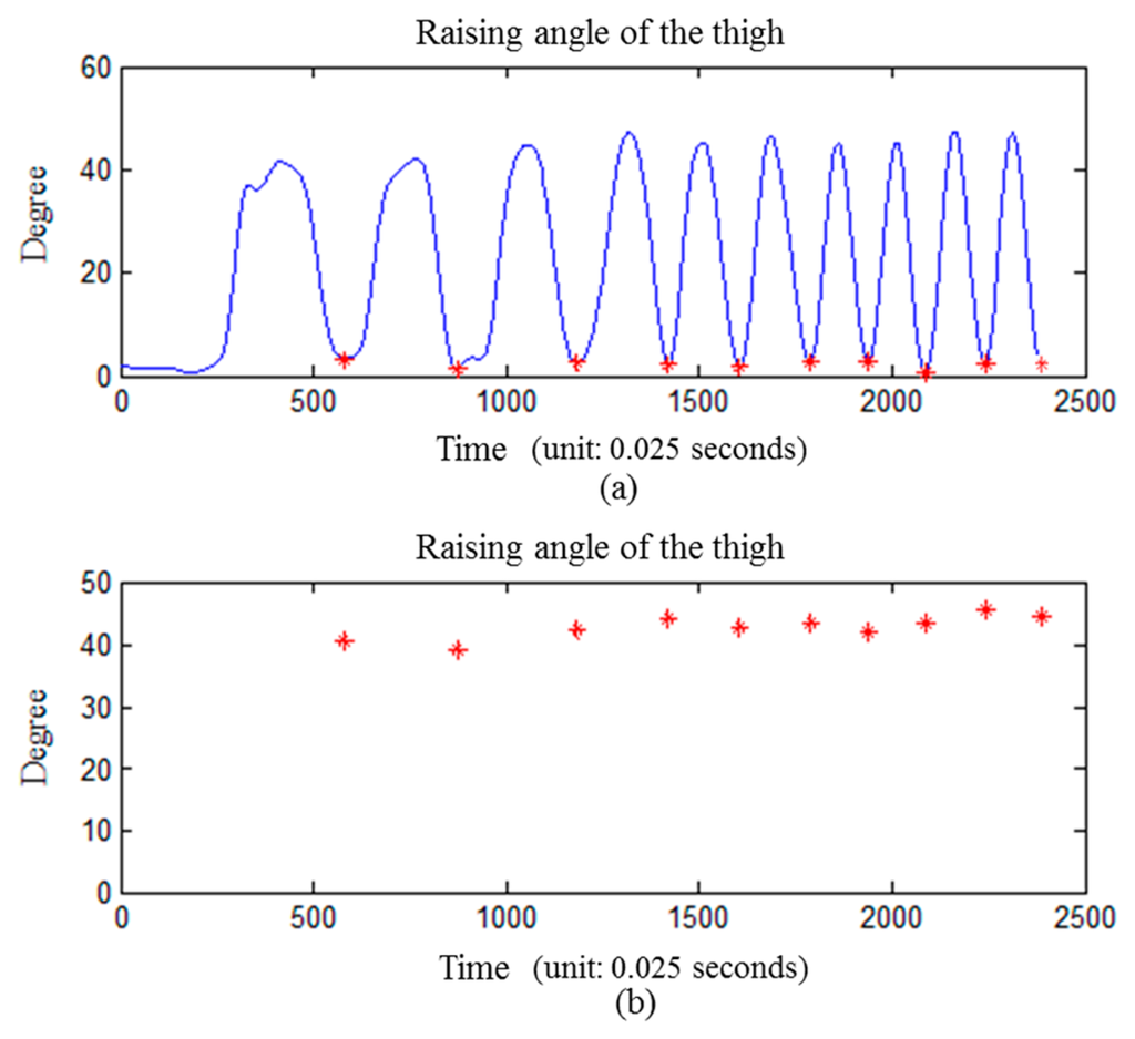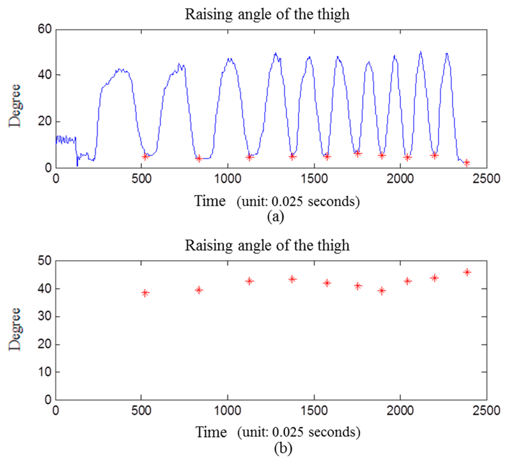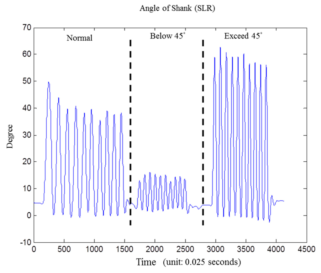Goniometers are widely used in clinical applications. In this study, a goniometer is used to assist subjects in achieving the desired posture in the experiment. For example, we perform an experiment to illustrate the calculated angle which was accomplished by an experienced orthopedic surgeon who measured the angle between the anterior thigh and anterior shank with the goniometer. A subject is asked to perform a standard movement of SLR for ten times with the goniometer properly applied. The angle variation is obtained by subtraction between the median of the 10% largest value and median of 10% smallest value on each time window. The result shows that only one of the movements exceed 45° ± 5°, and none of the movements exceeded 45° ± 10° (10° is the threshold value, as shown in Table 2), as shown in Figure 9.
