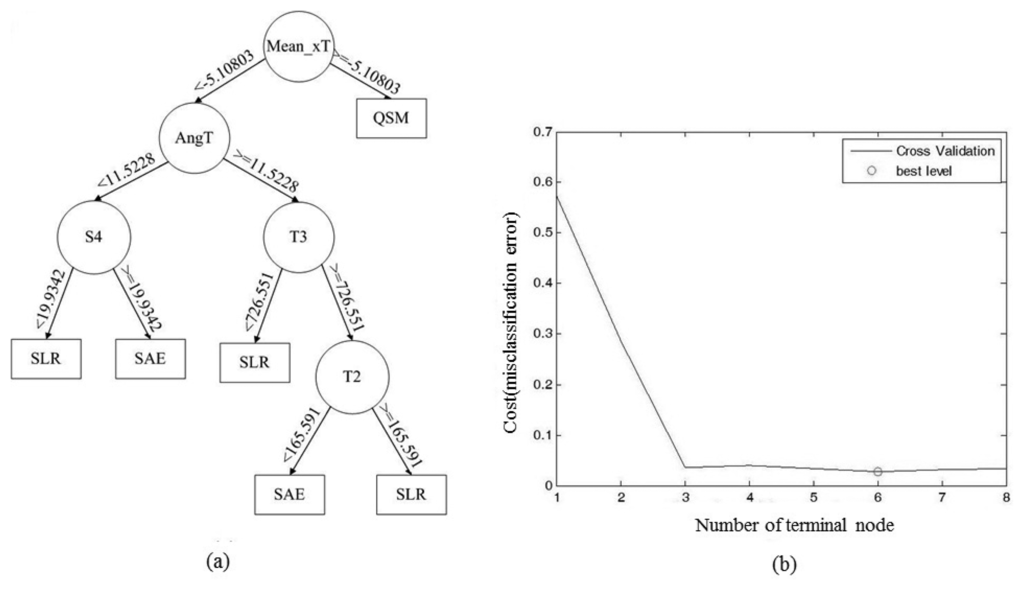 The generated decision tree is shown in Figure 12a. “Mean_xT” represents the mean value of the thigh sensor accelerometry on the x axis; “AngT” represents the highest thigh raising angle of each movement; “S4” represent the fourth component of FFT on the shank; “T2” and “T3” are the second and third component of FFT of the accelerometer attached on thigh. According to the training results of the decision tree, we can perceive that “Mean_xT” is the most discriminating feature since QSM is a standing movement; and “AngT” is the second most discriminating feature because the biggest difference between SLR and SAE is the thigh-raising angle. The time domain feature, frequency domain feature and angle information can be used as discriminating features of the decision tree in the exercise classification algorithm. We use hierarchical method to identify the improper rehabilitation exercises based on exercise rules. For example, the hierarchical method for QSM is shown in Figure 13.