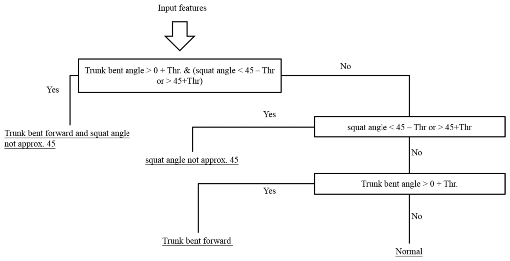 In exercise classification stage, we choose decision tree for its high accuracy and minimal computational complexity in activity recognition [9]. Then exercise rules would be extracted based on the results of exercise classification. Finally, the improper movement is identified by exercise rules we defined in Table 1. As shown in Figure 7, it's the shank angle variation graph during the SLR exercise, including “standard movement” and “raising angle not approximately 45 degree”.