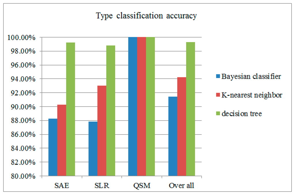 We also implement a Bayesian classifier and K-nearest neighbor classifier to compare with decision tree for exercise type classification. 10-fold CV is used to measure the accuracy of those classifiers. The result is shown in Figure 14. The classification results shows that the decision tree has the best accuracy compared with other classifiers. The impact might indicate that some differences between these classifier. The Bayesian and KNN classifier need a large dataset to train the recognition model. The decision tree classified by examining the discriminatory ability of the features one at a time to create a set of rules, which make decision tree classifier outperform others.
