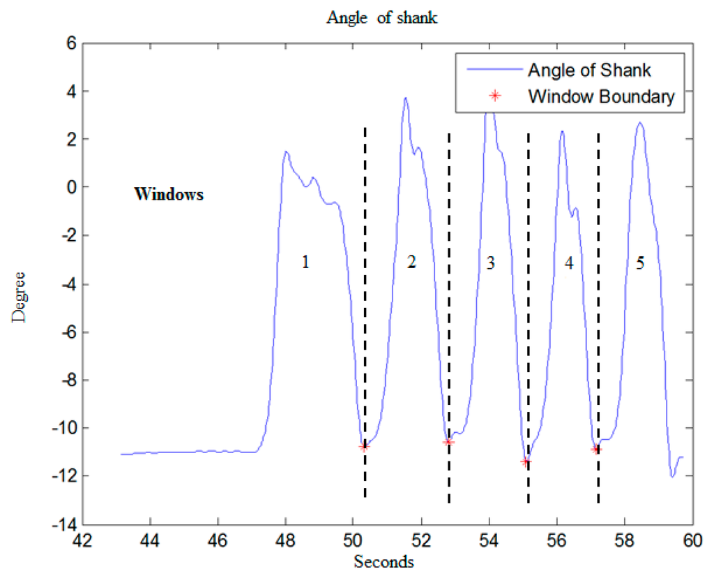 Regarding the segmentation of time windows, the rehabilitation exercises of knee OA in this work involve periodic angle variations of the shank, so the system utilizes a peak detection method on shank angle variation to define the start and end point of every movement. Figure 2 shows the shank angle variations during SAE movement, and the red points represent signal valleys. Then time windows are divided based on the signal valley points. Through this method, each window will accurately contain each movement repetition, unaffected by the different time it takes by users to complete each movement. This will allow users to perform rehabilitation exercises at their own comfortable speed instead of a fixed time.