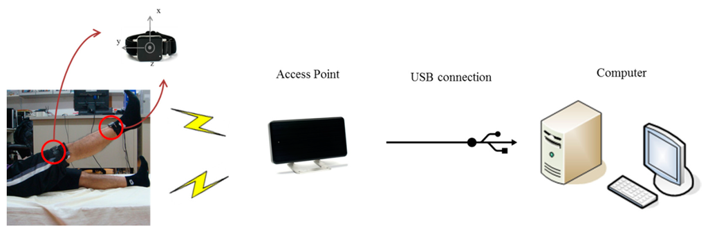 The hardware architecture is shown in Figure 3. The access point receives signal of accelerometers wirelessly from the sensor nodes and transmits those raw data to the workstation through a USB connection. Finally, the accelerations are processed on the working station using MATLAB. The wireless transmission protocol between the accelerometers and access point is robust synchronized streaming mode, which has a typical latency of about 300–400 ms.