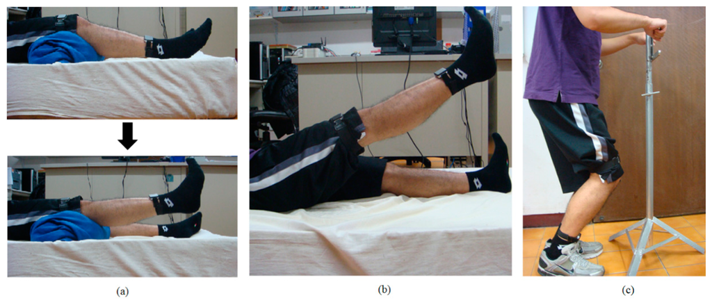 The wearing position of the sensor is a key factor in angle calculation. The sensors are all set at fixed positions in our experimental design, but there must be some deviation in the sensor position. We have performed 40 repetitions of SLR with two different positions of the thigh sensor. One is on anterior surface of the thigh, the same as in our experimental design, and the other is on the lateral surface of the thigh. The differences between the average angles in two different settings were 1.3° for raising angle, 1.0° for joint angle, and 7.6° for external rotation angle. The difference of external rotation angle is larger than others, so it shows that the position of the sensor really has an impact on the angle calculation.
