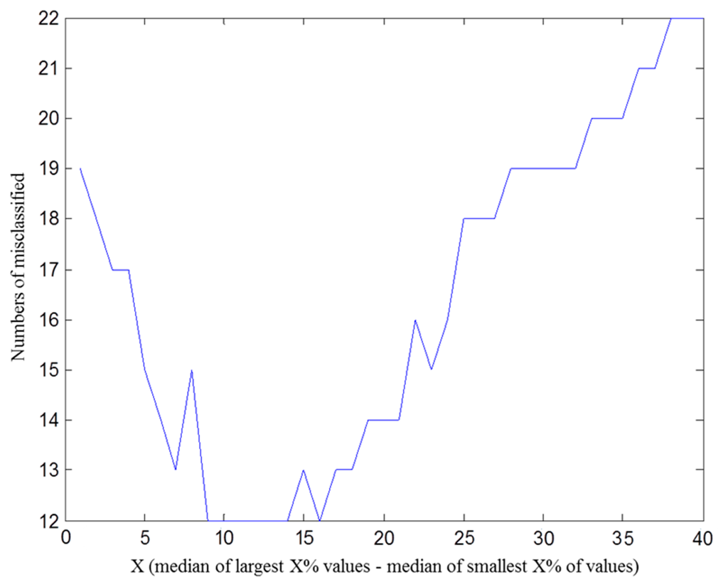 The calculated angles may contain deviations because sensors are placed on the human body instead of a flat platform. In order to calculate the variation of angles more accurately and compensate for the deviations caused by noises and initial sensor position angles, we calculate the difference between the medians of a fixed proportion of the largest and smallest values, and use this difference as an indicator of angle variation. In other words, we obtain the best angle variation by subtraction between the median of X% largest value and the median of X% smallest value on each time window. Figure 8 is the result that we use some subjects' angle information to determine the X value to get the best accuracy of improper movement detection.