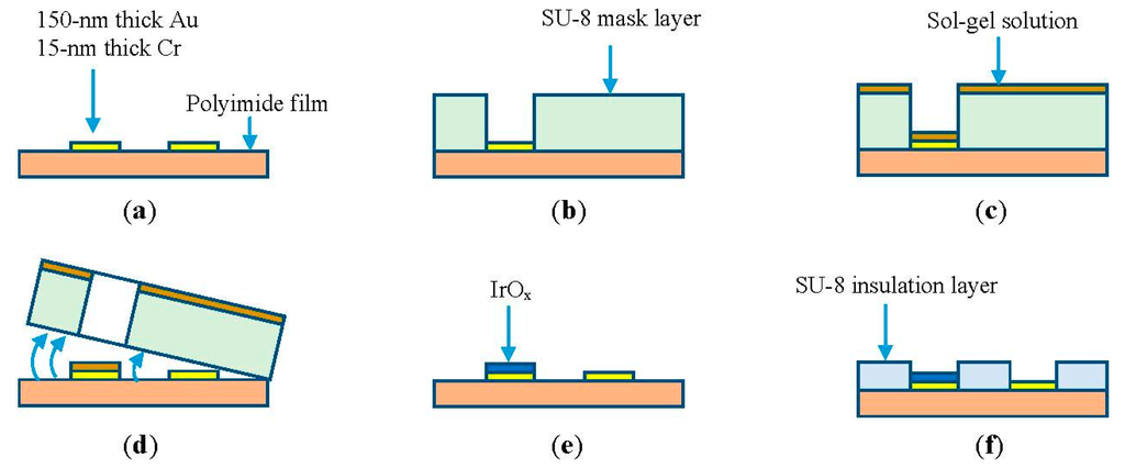 Microelectrodes of different dimensions were fabricated on a 125-μm polyimide flexible substrate. The substrate was cleaned with acetone and rinsed before applying 15-min heat treatment at 100 °C. Photolithography was carried out to pattern the microelectrodes of different sizes including 1 mm × 1 mm, 500 μm × 500 μm, and 100 μm × 100 μm for investigation. This was followed by deposition of layers of 15-nm thick chromium and 150-nm thick gold using an e-beam evaporator, as depicted in Figure 1a. Lift-off was carried out to release sacrificial layers revealing the micro-patterns. Next, the negative-tone photoresist SU-8 (MicroChem, Newton, MA, USA) was spin-coated to form a mask layer. The thicker the SU-8 layer was, the easier it was to peel-off later. However, it was tedious to handle the device during fabrication processes. Thus, the thickness of the sacrificial mask layer was chosen as 50 μm. Different types of SU-8 including SU-8-2025, SU-8-50, and SU-8-100 were tested. Based on our experimental data, we chose SU-8-50 to employ in the 50-μm thick mask, as illustrated in Figure 1b. The sample was then coated with an iridium chloride sol-gel solution (Figure 1c). The preparation of the solution and coating processes are described in Section 2.2. Figure 1d illustrates the peeling-off process after the first heat treatment step. The second heat treatment at 300 °C was carried out to form a thin layer of iridium oxide (Figure 1e). In the final step, a 5-μm thick SU-8-5 layer was coated as an insulation layer covering the entire microelectrode except the sensing areas and connection pads, as shown in Figure 1f. Finally, copper wires from external measurement circuits were connected to the pads using silver epoxy.