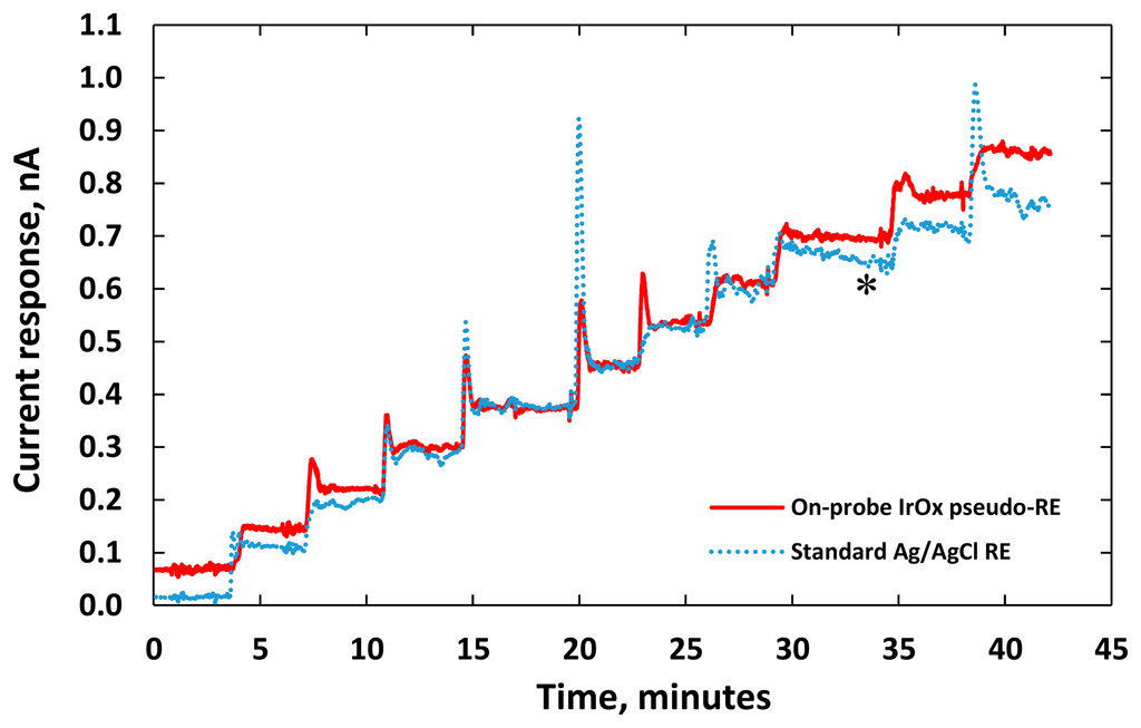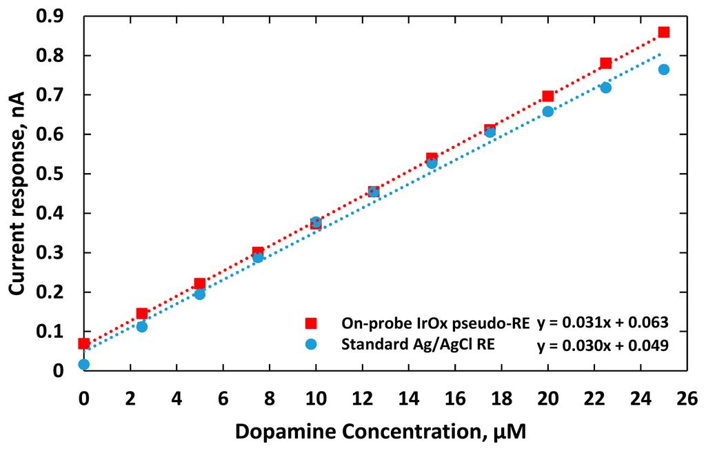 We have also investigated the possibility of implementing IrOx electrodes for both working and reference electrodes. Dopamine sensors with the WE and RE on the same probe were fabricated with the same sol-gel batch processes. Each electrode had a size of 50 μm × 100 μm. A bias voltage of 0.7 V was applied between the two electrodes. The tests were carried out by incrementally adding DA to the PBS solution, as before. At the same time, another DA sensor consisting of a gold WE and a standard Ag/AgCl RE was placed in the beaker to compare results.