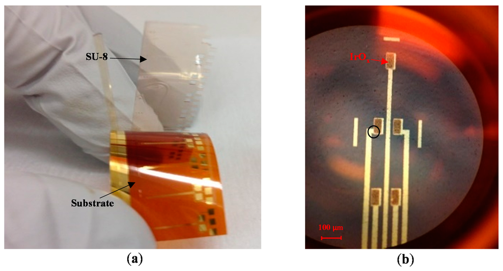 After the sol-gel dip coating step, the sample was subjected to heat treatment to generate IrOx from iridium chloride. First, a heat treatment step at 100 °C for 15 min dehydrated the sol-gel solution. Afterwards, the SU-8 sacrificial layer was peeled-off by bending the flexible substrate, as shown in Figure 2a. It should be noted that the adhesion of SU-8 to the substrate is poor; therefore, the sacrificial mask was automatically detached by mechanical stresses. Next, a second heat treatment step was carried out with the samples in an oven. The heating profile was: (1) ramp-up to 300 °C at a rate of 2 °C/min; (2) soak at 300 °C for four hours; and then (3) ramp-down to 25 °C at a rate of 1 °C/min. This step completed conversion of hydrated iridium chloride into iridium oxide, as illustrated by color change from brown to blue in Figure 1e. The optical microscope photo in Figure 2b shows an MEA with five electrodes. Each electrode has opening area of 50 × 100 μm2 and was coated with IrOx.