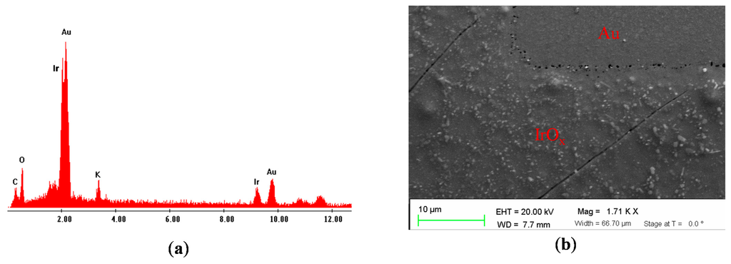 Iridium oxide fabricated by sol-gel deposition was characterized by energy dispersive spectroscopy (EDS). Figure 3a shows the material composition on the surface of the electrode after sol-gel deposition. There were clear peaks of different materials including Ir, Au, C, O and K with composition percentages of 18.19%, 47.18%, 17.69%, 15.19% and 1.74%, respectively. The presence of carbon element was due to polyimide substrate while there was small amount of potassium due to contamination. Scanning electron microscopy was also utilized to examine of the surface morphologies of the micro-electrode. The composition of the film is similar to the one made by one-step sol-gel heat treatment. Figure 3b shows the surface of the electrode coated with IrOx, which was rougher than the one in the Au area. Micro-scale porous structures of IrOx were observed. The porous structures with a high surface-to-volume ratio could affect electrochemical properties of the bulk IrOx such as the ion exchange, rate to reach the equilibrium point of reversible reaction, or the amount of charge storage [18].