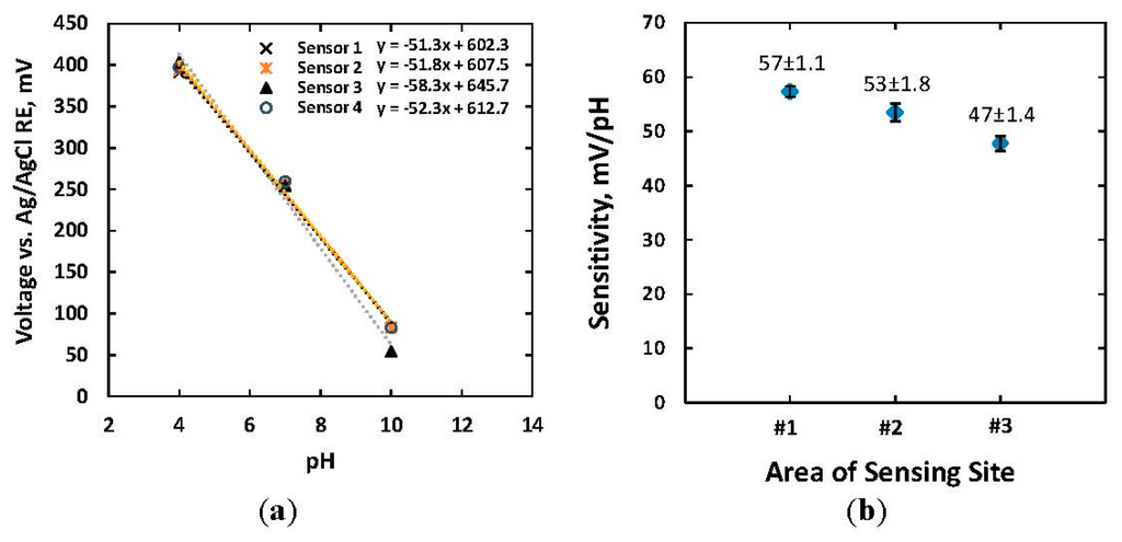 Figure 4a shows the responses of four IrOx electrodes, each of 500 μm × 500 μm size, to standard buffer solutions. The absolute slopes of pH responses were in a range of 51.3–58.3 mV/pH with a linear regression of approximately 0.993, which indicated a Nernst response according to Equation (2). Standard error of the means (SEMs) of the measurements were 5.0 mV, 1.4 mV and 6.9 mV when measuring with commercial buffer solutions of pH = 4, 7, and 10, respectively. Less SEM in the case of the solution pH = 7 indicated higher reproducibility of pH measurements in neutral solutions. The measured pH sensitivities of IrOx-based electrodes with various dimensions are shown in Figure 4b. Four electrodes of the same size were measured to obtain statistical variations. There were slight differences in sensitivity for electrodes size of 1 mm × 1 mm and 500 μm × 500 μm, which were 57 ± 1.1 and 53 ± 1.8 mV/pH. The smaller electrodes with a size of 100 μm × 100 μm exhibited less pH dependence of 47 ± 1.4 mV/pH. The relationship between electrode potential and electrode size has not been well-studied yet the Nernst equation does not regard the sensor size. However, the empirical study showed that the smaller electrode possessed less sensitivity. There are two possible reasons for the aforementioned phenomenon. Firstly, the reduced sensitivity of the miniature electrode might relate to the double layer region and diffusion layer formed around the finite space of the microelectrode in electrolyte solutions [35]. The ratio between the thickness of the diffusion layer and physical dimension of the electrode in such case became larger [35]. Bard et al. demonstrated that the profile of steady-state ion concentration was proportional to the inverse of distance from the electrode surface [35]. In other words, the local ion concentration and distribution of proton H+ near the surface of the electrodes pH|x=0 became complex and was adjusted from bulk ion concentration. Thus, the microelectrode showed less sensitivity to pH change of the solution. Secondly, a higher impedance in the smaller microelectrode (∼MΩ) which was comparable to the input impedance of the measurement system reduced the measured voltage from the actual open-circuit potential. An ultra-high input impedance will be needed in such cases.