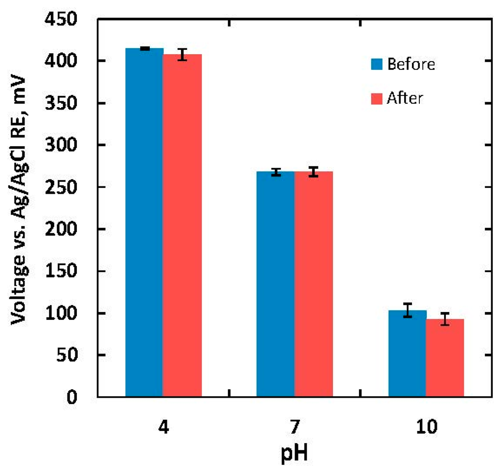 We noticed the pH sensitivity was reduced and remained at 42.0 ± 0.6 mV/pH when the sensor were kept dry within 6 days of fabrication, as shown in Figure 6d. The sensor sensitivity recovered to the Nernst performance after immersing in an aqueous solution for three hours. The highest SEM in three measurements of 3.65 mV/pH was higher than the ones for the other electrodes in solutions. The lower sensitivity and higher variations in responses were probably due to dehydration and air filling up the micro- and nanoscale pores in the IrOx film surface. In other words, longer time was needed for the equilibrium points of the redox reaction to reach after ions exchange between solution and surface particles. Therefore, we concluded that the IrOx-based electrodes should be preserved or presoaked in a hydrated condition such as PBS solution after fabrication in order to provide stable potentials. Identical conditions are also suggested for most commercially available reference electrodes.