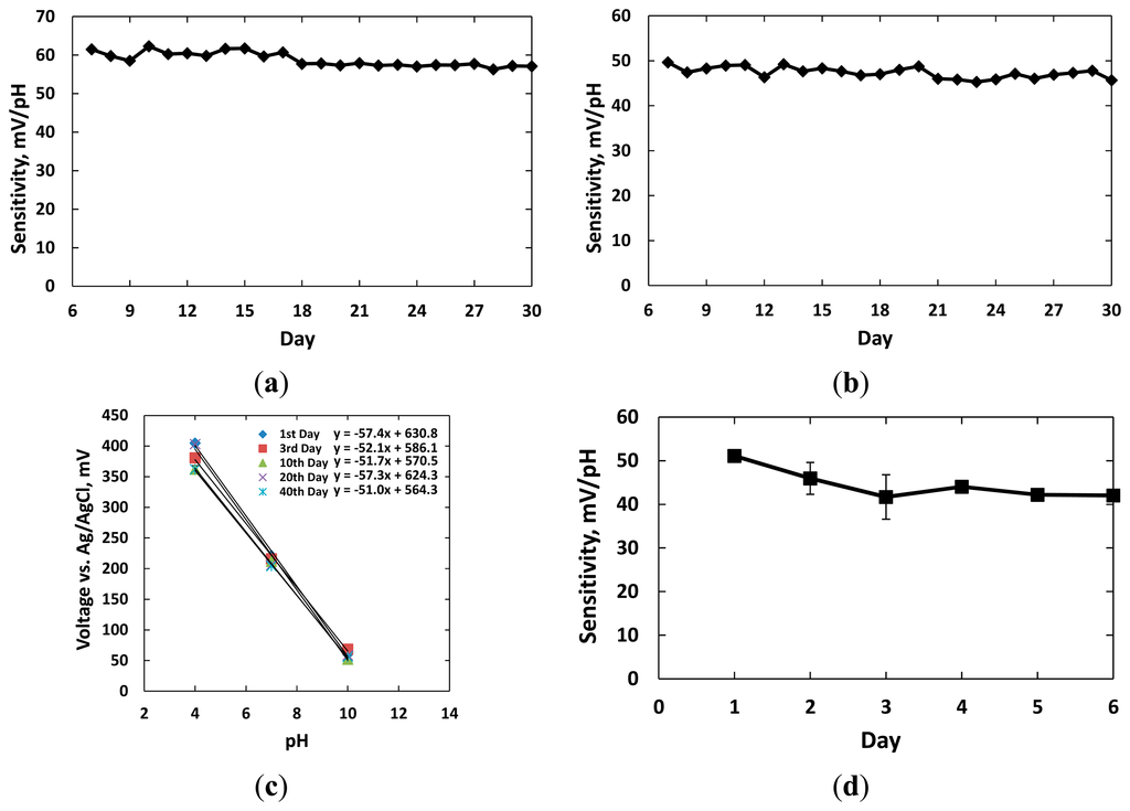 Figure 6a shows the responses of three sensors kept in the acidic solution with pH = 2 over 30 days. The measurements were conducted after the 6th day. The pH sensitivities of three sensors remained at 57.3 ± 0.6 mV/pH after the 30th day. Standard deviation of the calibration data over 30 days was less than 1.9 mV/pH, which reflected stable performance of these sensors. Figure 6b shows the responses of three sensors kept in the alkaline solution with pH = 10. We noticed that the SU-8 insulation layer visually degraded and wrinkled while soaked in the alkaline solution after five days; however, the experiments were continued. The sensitivities of three sensors in this group were recorded at 48.1 ± 0.55, 47.7 ± 0.61 and 48.0 ± 0.66 mV/pH after 30 days. The reduction in sensitivities was probably due to residues of alkaline solution and hydroxyl ions deeply absorbed and retained at the micro- and nanoscale IrOx pores [8]. The ion exchanges decreased diffusion processes and also altered equilibrium points from the double layer region when new solutions were tested. Both effects changed the electrode potentials of the sensors.