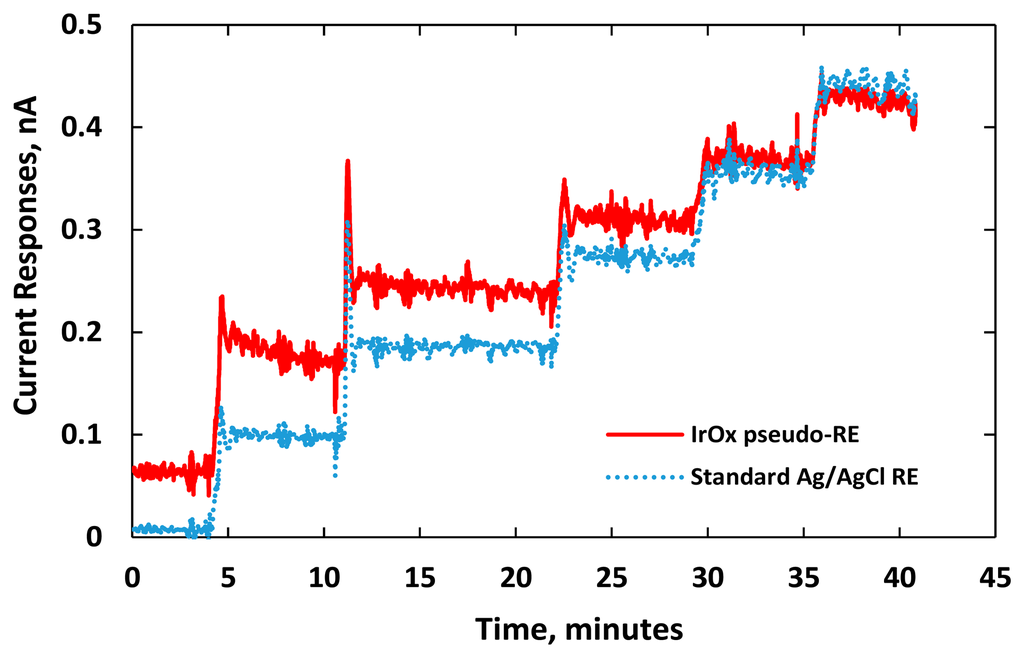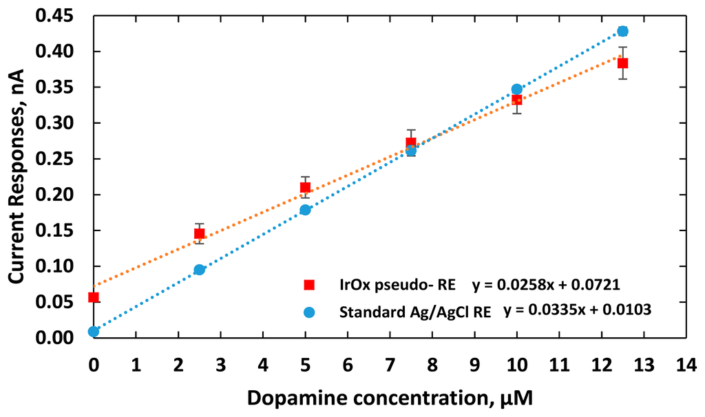 The experiments were repeated three times recording electrical currents at various DA concentrations. As shown in Figure 8, the sensitivities of the two DA sensors were measured as 25.8 ± 0.07 and 33.5 ± 0.01 pA/μM, for using the IrOx pseudo-RE and a standard Ag/AgCl RE, respectively. Due to the fact that the highly electroactive IrOx has fast reversible redox reactions or a larger rate of reaction k0 [40,41], the DA sensor using the IrOx pseudo-RE has an output with higher baseline current. The measurements also indicated that the sensor exhibited less sensitivity than the one with a standard reference probe. It should be noted that the pseudo-RE has a miniature size (50 μm × 100 μm). According to Equation (5), its sensitivity is expected to be less due to its higher impedance. Besides the electrode dimensions, to optimize the sensitivity, other factors should also be considered including spacing between the WE and RE, acquisition instrumentation configurations (input impedance and gain) and working electrode materials.