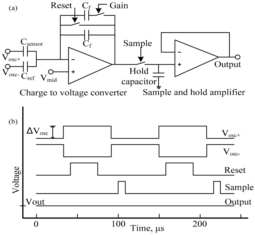In operation, two 10 kHz square wave signals VOSC+ and VOSC− with same amplitude but opposite phase are used to drive the sensor capacitor, Csensor and reference capacitor, Cref. Their amplitude is defined as ΔVosc. Vmid is a DC voltage applied to the non-inverting node of the amplifier. Reset, Sample and Gain are control signals where the Gain switch can adjust the feedback capacitance in the circuit, Cfedback, to be either Cf or 2Cf. In the present design, the values of Cf and the hold capacitor, CH are both set as 1 pF. The waveforms of the control and output signals for the converter circuit are shown in Figure 1b. The amplitude of the output voltage can be expressed as Equation (1),