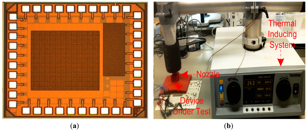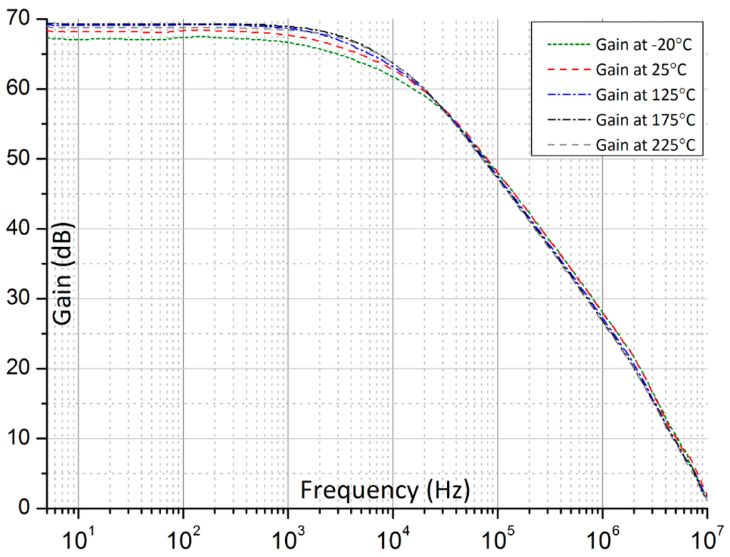 The CMOS sensor interface circuit is fabricated using the IBM 0.13 μm CMOS process available through the Canada Microelectronics Corporation. The microphotograph of the fabricated chip is shown in the inset of Figure 3a. The chip is placed under the nozzle of a thermal inducing system (Thermostream TP04100A, Temptronic Corp., Mansfield, MA, USA), where the chip temperature can be varied from −20 °C to 225 °C, which is the temperature limit of the Thermostream testing system as shown in Figure 3b. The temperature under the nozzle is monitored using a thermocouple and the temperature accuracy is better than ±1 °C. Figure 4 shows the measured single-ended open-loop gain of the amplifier driving 2 pF load capacitance at different temperatures. From −20 °C to 225 °C, the measured DC gain varies by only 2.1 dB. The measured amplifier power consumption (including constant-gm biasing circuit) at 225 °C is 0.51 mW. We tested three out of five received packed chips and all showed similar frequency response versus temperatures.