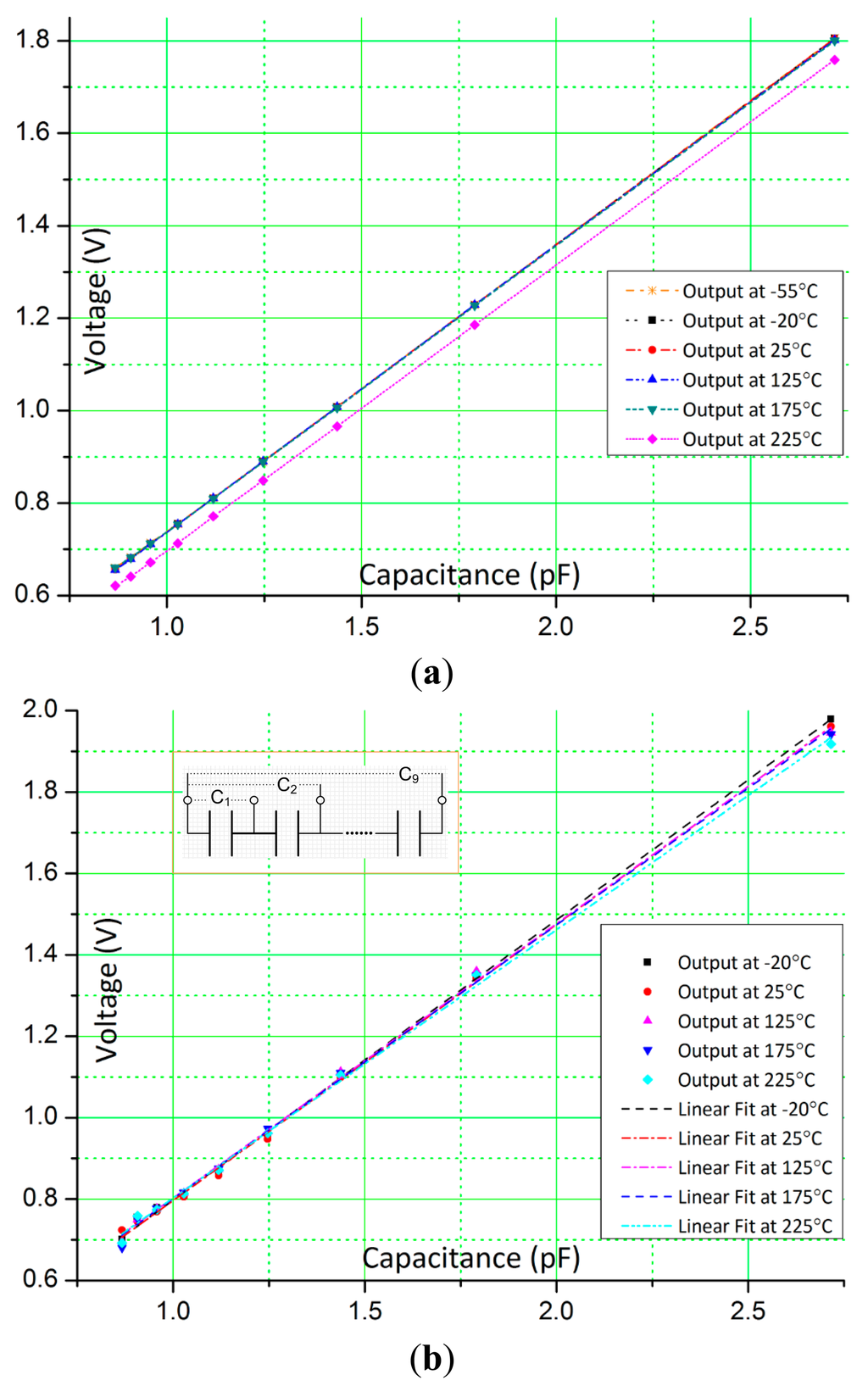 Figure 5a,b show the output voltages for different capacitance values during calibration at temperature ranges, simulated from −55 °C to 225 °C and measured from −20 °C to 225 °C. Again, the measured temperature range is less due to the limit of the Thermostream testing system. Generally, colder temperatures between −55 °C and −20 °C do not have detrimental effects on CMOS electronics and further help to improve signal to noise ratio due to reduced noise effects. The calibration capacitance, Csensor, is constructed by using nine capacitors, C1 to C9 (shown in inset of Figure 5b) with nominal capacitance value of 1 pF which are connected in series. By appropriately changing connections from C1 to C9, the capacitance value of Csensor is varied and measured using a high resolution universal capacitance readout circuit, MS3110 (MicroSensors, Costa Mesa, CA, USA) that is maintained at room temperature (25 °C).