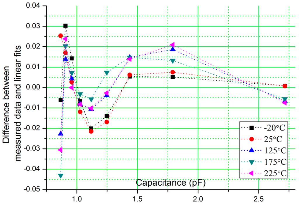 The control signals, Vosc+, Vosc−, Reset and Sample are generated by a data acquisition card, NI USB-6259 (National Instruments Inc., Austin, TX, USA). The amplitude of Vosc is set to 1.25 V, Vmid is set to analog ground 1.25 V, the feedback capacitance, Cf is set to 2 pF, and the reference capacitance, Cref is fixed to 1.805 pF. The sensor capacitor, Csensor, and reference capacitor, Cref, are placed at room temperature (25 °C) with only the test chip which includes the on-chip feedback capacitor Cf exposed to the temperature change from −20 °C to 225 °C. From Figure 5, the measured results show similar response as simulated results. Over the wide temperature range, the circuit converts the input capacitance to output voltage with goodness-of-fit of linear regression of 0.998 (R2). Figure 6 shows the difference between the measured results and the linear fits, which is defined as, (measured value-fitted value)/(fitted value). The overall difference is around 2%, and larger difference is observed when the sensor capacitance is smaller and at high temperatures. The tested linearity is worse than the simulated results, especially when the capacitance is smaller and its probable cause could be interconnect parasitic capacitance in the experimental setup.