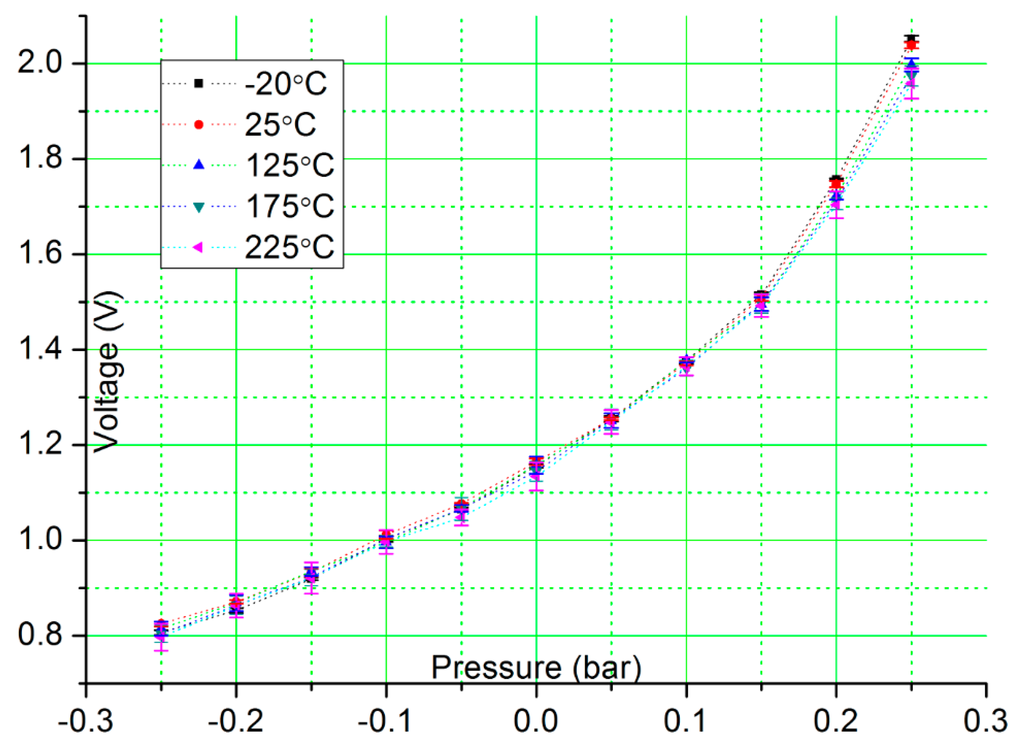The CMOS circuit is interfaced with a capacitive MEMS pressure sensor from Protron Mikrotechnik GmbH, Germany [] by replacing the Csensor with the pressure sensor in Figure 1. The feedback capacitance, Cf is set to 2 pF. The sensor operates within a temperature range from −40 °C to +85 °C with a sensitivity of 1 fF/mbar. During our experimental testing, the MEMS pressure sensor is maintained at room temperature (25 °C) and placed in a pressure vessel so that its capacitance output does not change with ambient temperature and only varies when external pressure is applied to the pressure vessel. Figure 7 shows the measured output voltage to pressure change when the CMOS sensor interface circuit is exposed to temperature range from −20 °C to 225 °C. The MEMS pressure sensor is exposed to pressure variation from −0.25 bar to +0.25 bar. All measurements are done in triplicate with the average value noted in Figure 7. As can be seen, the output voltage from the CMOS circuit changes in accordance with the capacitance change of the pressure sensor and provides a stable response over a temperature range from −20 °C to 225 °C. The estimated sensor readout resolution is 2.322 mV/mbar at 225 °C. As temperature increases, the output noise becomes larger. The simulated noise analysis shows the noise level at the output of the circuit in Figure 1a increases from 0.134 mVHz−1/2 to 0.184 mVHz−1/2 when temperatures changes from −55 °C to 125 °C. Another major error source at high temperatures is the leakage current in the Sample switch, which can cause a voltage drop or rise on the hold capacitor, depending on the direction of the leakage current. This problem can be alleviated using higher sampling speed, or increasing the capacitance of the hold capacitor. A sample/hold circuit with dynamic switch leakage compensation [] can also be used, with the penalty of increased circuit complexity.