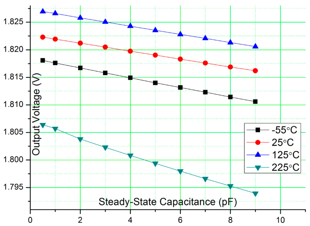 As can be seen, due to the differential readout scheme, the C0 component is cancelled and only ΔC is considered. Figure 8 shows the simulated output voltage for different steady-state capacitance from −55 °C to 225 °C. The TCs of sensor capacitor and reference capacitor are set to 100 ppm/°C. ΔC is set to 0.5 pF at 25 °C, Vmid and ΔVosc are set to 1.25 V, and Cfeedback is set to 1 pF. As can be seen, when the steady-state capacitance changes from 0.5 pF to 10 pF, the output voltages decrease only about 20 mV. This shows the circuit has good flexibility to interface with MEMS sensors with a wide range of the steady-state capacitance values. At a fixed steady-state capacitance, the output voltages change by less than 30 mV when temperature varies from −55 °C to 225 °C. This means the TC difference has very limited impact to the interface circuit. For MEMS sensors which do not have a reference capacitor, low TC mica capacitor (with TC about 50 ppm/°C) can be used as reference capacitor.