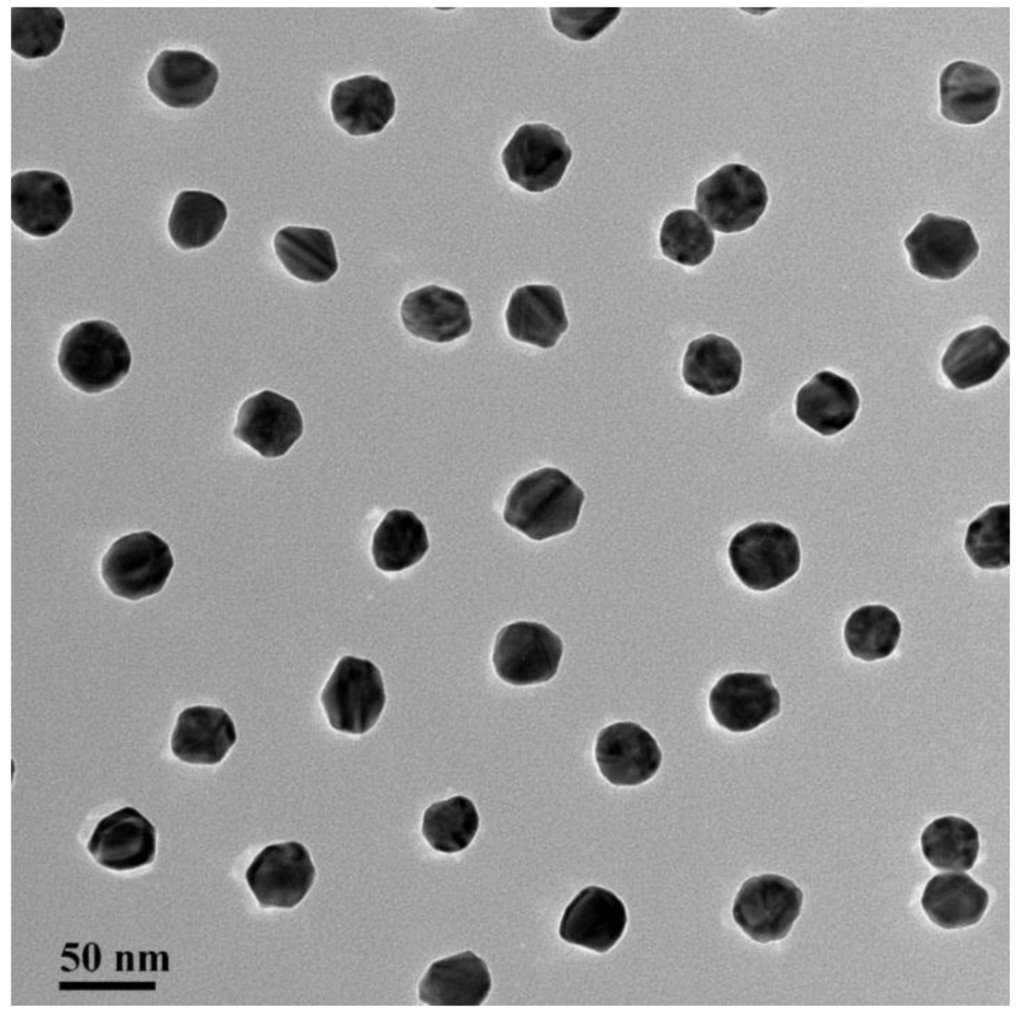 Colloidal gold particles were prepared []. Briefly, 200 mL of 0.1 g/L chlorauric acid was heated to boiling under constant stirring (100 g), mixed with 8.0 mL of 1% trisodium citrate (w/v) at 300 °C, and stirred for 10 min until the color of the solution turned from yellow to wine-red. The solution was allowed to cool at room temperature under constant stirring and stored at 4 °C. All solvents were prepared with deionized water. Transmission electron microscopy (TEM) examinations revealed that the gold nanoparticles had uniform particle size (approximately 30 nm in diameter; Figure 1).
