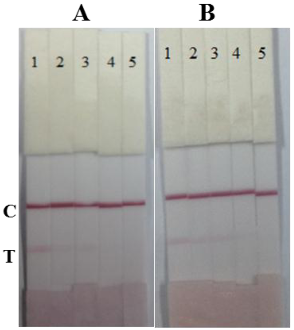 The assay sensitivity was confirmed with a series of diluted standards. GNP-mAb (50 μL) was mixed with sample solution (150 μL), allowed to react at room temperature for 5 min, and added to the sample pad of the strip. The concentrations of the standards were 1 × 107, 3.3 × 106, 1 × 106, 3.3 × 105, and 1 × 105 cfu/mL Pss in 0.01 M PBS (pH 7.4). The results are shown in Figure 4.