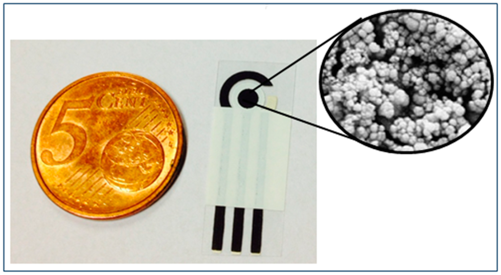 Screen-printed electrodes (SPEs) were produced in our laboratory by thick film technology (TFT) with a 245 DEK (Weymouth, UK) screen-printing machine. SPEs consisted of a working electrode in graphite modified with Prussian Blue nanoparticles (PBNPs), a reference electrode in silver/silver chloride, and a counter electrode in graphite (Figure 1). Graphite based ink (Electrodag 421, Acheson, Henkel, UK), silver/silver chloride ink (Electrodag 4038 SS) and insulating ink (Carboflex 25.101.S, Acheson, Henkel, UK) were used. A flexible polyester film (Autostat HT5) obtained from Autotype Italia (Milan, Italy) was used as substrate. The electrodes were home produced in sheets of 48 each. The diameter of the working electrode was 0.3 cm, resulting in a geometric area of 0.07 cm2 [19]. The SPEs were then modified with Prussian Blue nanoparticles and this was accomplished by placing a drop (10 μL total volume) of “precursor solution” on the working electrode area [20]. This solution was obtained by mixing 5 μL of 0.1 M potassium ferricyanide in 10 mM HCl with 5 μL of 0.1 M ferric chloride in 10 mM HCl directly on the surface of the working electrode. The drop was carefully pipetted to be localized exclusively on the working electrode area. The solution was left on the electrode for 10 min and then rinsed with a few mL of 10 mM HCl. The electrodes were then left 90 min in the oven at 100 °C. The PBNP-modified electrodes were stored dry at room temperature in the dark.