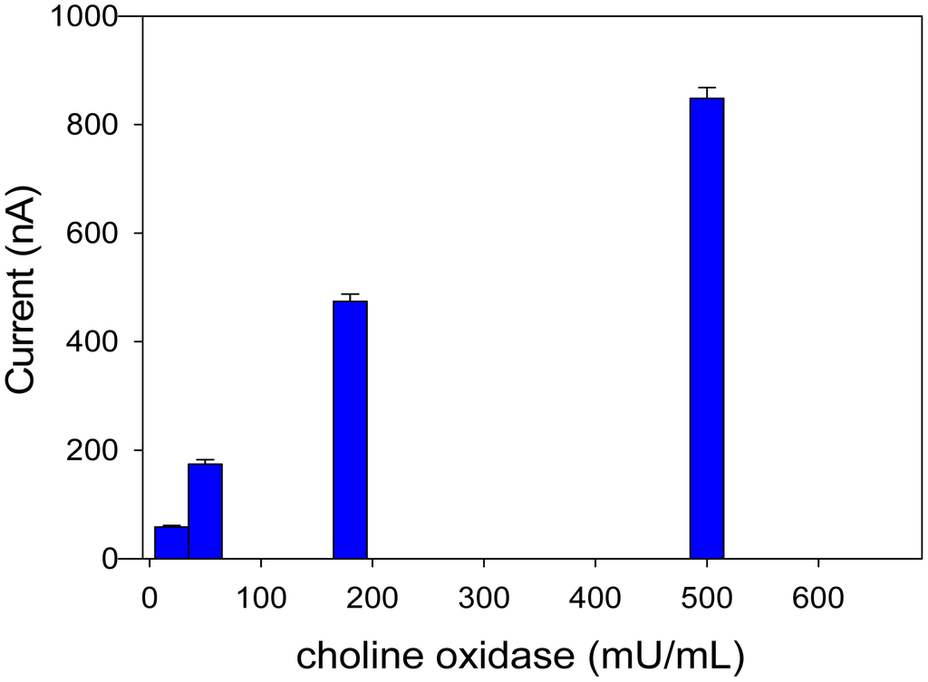In order to optimize the concentration of choline oxidase, a study on the enzyme response as a function of enzymatic units was carried out. According to the experimental data presented in Figure 2, a choline oxidase concentration of 180 mU/mL was selected. This choice represents a compromise between cost of the enzyme and measurement accuracy. For instance, using a lower enzyme concentration (i.e., 20 mU/mL) current values of about 60 nA were obtained with a RSD of 4.3%; instead, using a higher enzyme concentration (i.e., 180 mU/mL), the higher current values of about 500 nA were reached with a lower RSD of 2.9%. As expected, a lower repeatability was obtained using 3 min as reaction time with 20 mU/mL enzyme; indeed an extended reaction time was required to reach current intensities with higher accuracy. On the other hand, an enzyme concentration of 500 mU/mL allowed a lower RSD of 2.3%; however, the analysis was more expensive due to the cost of the additional enzyme.