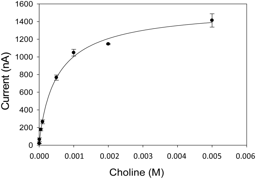 Using an enzyme concentration of 180 mU/mL, a calibration curve for choline measurement was recorded (Figure 3). An increase of the reduction current occurred in the presence of substrate, and the current was registered and sampled at 180 s, showing amperometric signals proportional to H2O2 concentration and consequently to the reaction rate as a function of a substrate concentration increase. The Michaelis-Menten constant, KM, for choline was determined using the Michaelis-Menten equation: