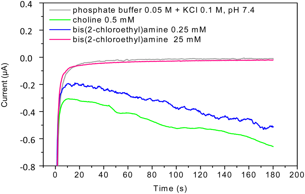 The sulfur mustard agent simulants (2-chloroethyl ethyl sulfide and 2-chloroethyl phenyl sulfide, also known as half-mustards) and the nitrogen mustard agent simulant bis(2-chloroethyl)amine were used as target analytes. Since MAs are highly toxic and their use in no-security laboratories is restricted, the bioassay was developed using these simulants employed also in literature [22]. Figure 4 showed a typical amperogram indicating values of the current reduction in function of time, derived from the enzymatic production of H2O2. A decrease of the amperometric signals occurred upon increasing of the inhibitor concentration. In particular, the grey line represented an analysis of a solution of 0.05 M phosphate buffer + 0.1 M KCl, pH 7.4 in the absence of choline oxidase, where the signal was constant and close to zero; green line represented an analysis of a solution of 0.05 M phosphate buffer + 0.1 M KCl, pH 7.4 in the presence of choline oxidase and choline, where the signal indicated the production of H2O2 due to the enzymatic reaction; whereas blue and pink lines were signals of a solution of 0.05 M phosphate buffer + 0.1 M KCl, pH 7.4 in the presence of choline oxidase, choline and bis(2-chloroethyl)amine at a concentration of 0.25 mM and 25 mM, respectively. At high concentration of simulant (25 mM) the inhibition percentage was close to 100%.