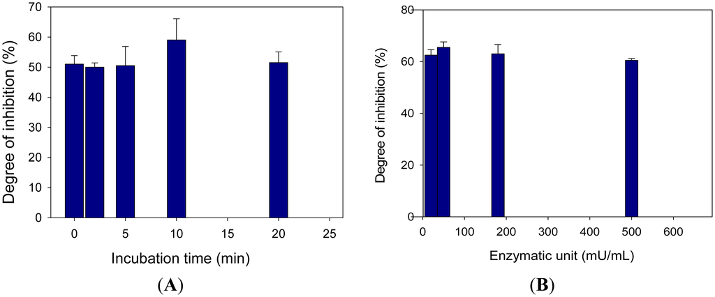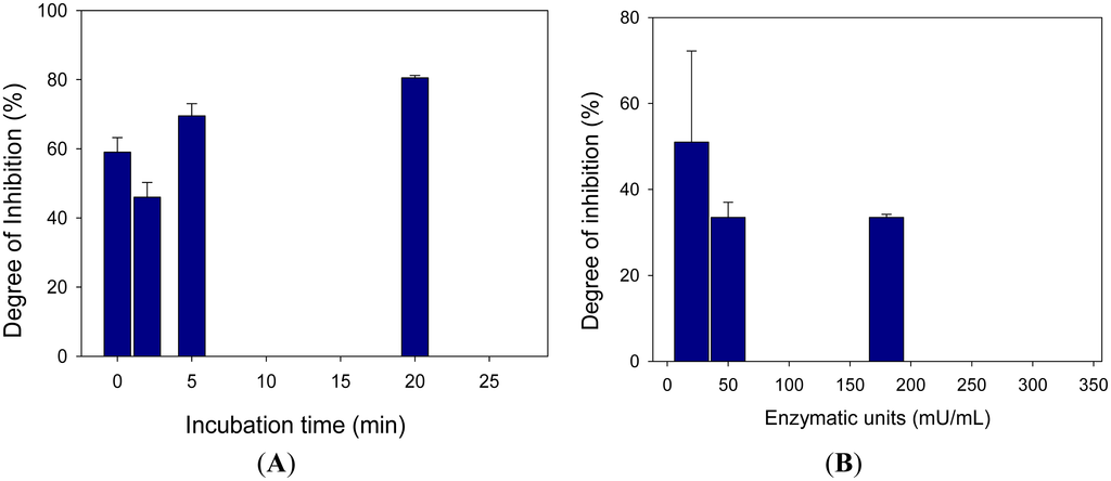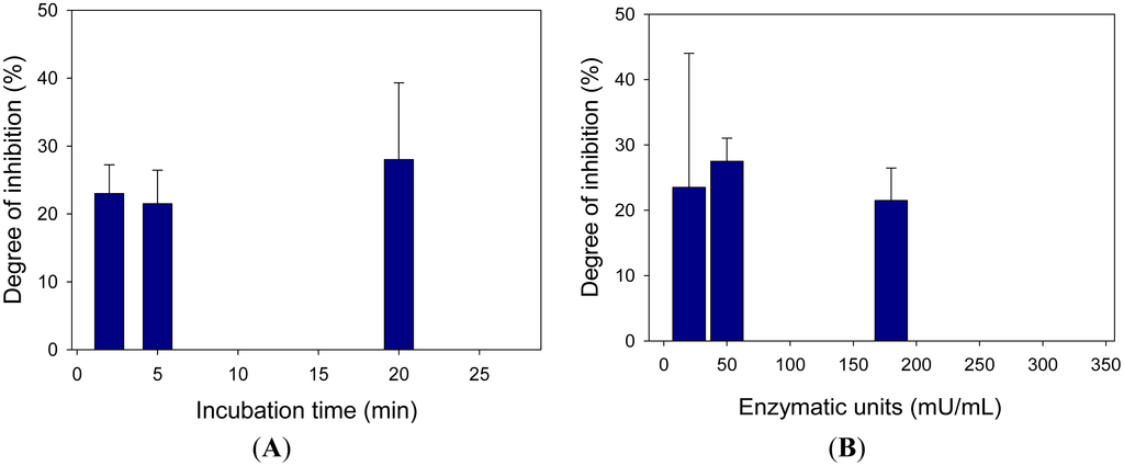 Analyses of the percentage of inhibition due to the simulant bis(2-chloroethyl)amine were investigated as a function of incubation time and enzyme units. As reported in Figure 5A,B, the results showed that the percentage of inhibition was almost constant in function of the two parameters, indicating that the inhibition mechanism was reversible, as well as the measurements of satisfactory reproducibility.