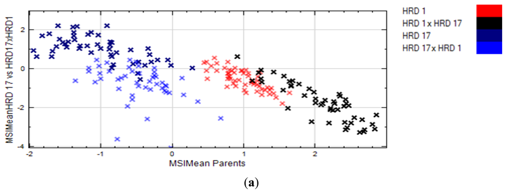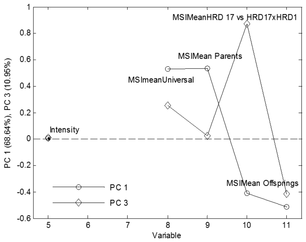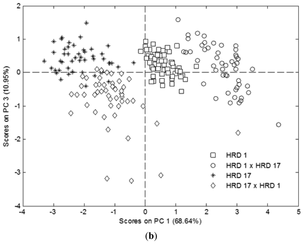 The loading plot (Figure 4) shows the same information responsible for separation as obtained from nCDA discrimination, i.e., nCDA transformation on two parents and other transformation comprising HRD 17 and its offspring (HRD 17 × HRD 1).
