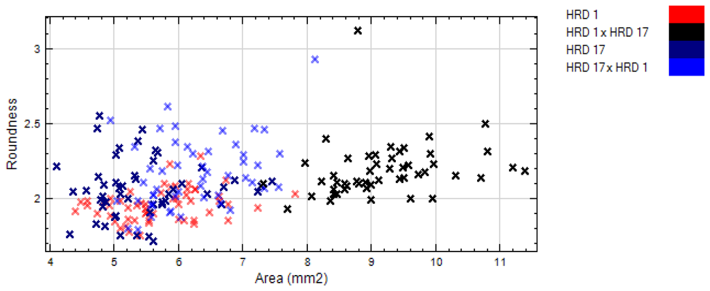 RegionMSImean was able to discriminate parents and their crosses. nCDA transformation of the two parents and of HRD 17 and its offspring (HRD 17 × HRD 1) gave the best separation (Figure 2a). Shape features like area, length, etc. of seeds were also analyzed but displayed inferior separation, except for the cross HRD 1 × HRD 17, which showed good separation with others (Figure 3).