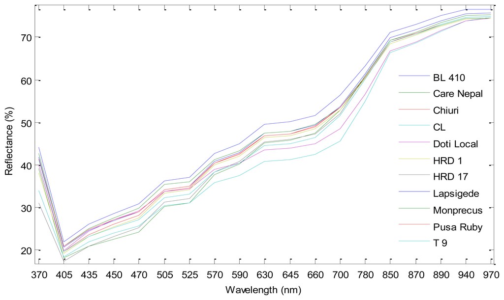 As morphological markers are incompetent in assessing differences of genetic identities and relationships among varieties having modifications on quality traits (seed or useful economic attributes) and as application of molecular markers requires high cost, time and is sophisticated [29], multispectral imaging provides a wider opportunity to integrate at commercial and scientific level. Its proven capacity to separate the individual with high genetic similarity like transgenic crops [13] gives further significance on its endorsement at any level.