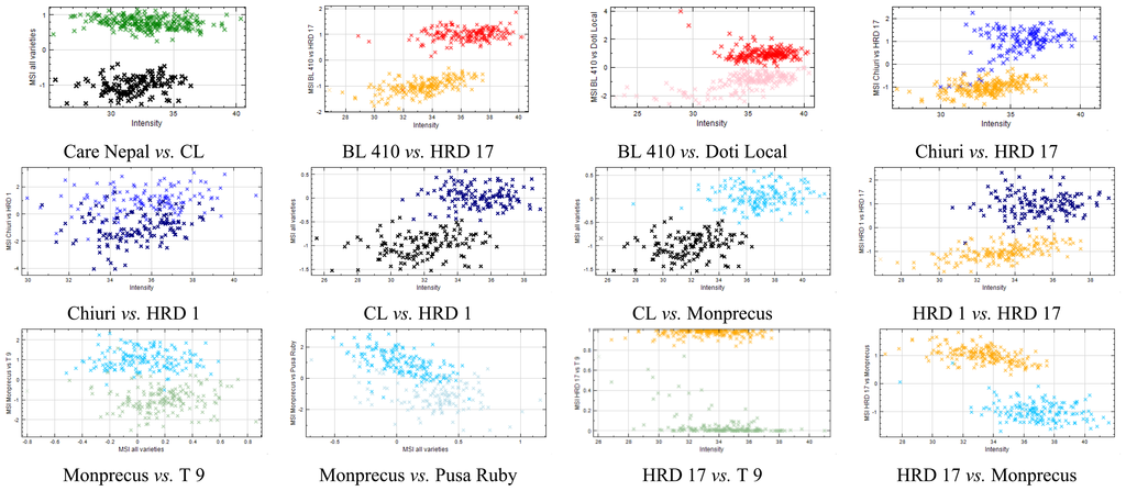 All eleven cultivars have variation among them as depicted by the mean pixel intensity of each cultivar (Figure 5). Pairwise comparisons were done with all cultivars to assess the diversity among cultivars and discriminatory ability of multispectral imaging using VideometerLab software. The several features (color/shape) were tested against each other to find the best separation between cultivars. Shape features like area, length, width, etc., which represent the pixel area/size of the seed images, did not give a good separation for any cultivars, suggesting that the physical parameter of tomato seed shapes are more or less similar to each other, and therefore an insufficient trait for varietal identification. Gunn and Gaffney [26] also reported that the external seed characters (seed size and shape) are not always enough for reliable seed identification. Blob feature RegionMSImean when compared with intensity (mean pixel intensity of the image) gave best separation. MSI universal (RegionMSImean comprising nCDA transformation of all cultivars) was able to discriminate between some pairs of cultivars, mostly those involving Care Nepal and CL. For the rest of the pairs, MSI local (RegionMSImean comprising nCDA transformation between two respective cultivars) gave the best separation (Figure 6). Threshold values were determined as zero for pairs involving MSI local (involving two selected varieties) and a value for MSI universal (includes all varieties for a transformation) for best separation between the pairs and were later used for validation on unknown set.