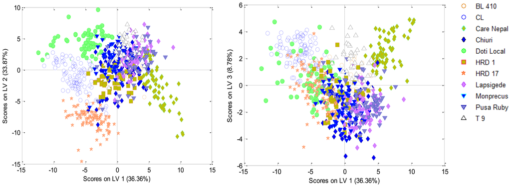 A distinct separation between all eleven cultivars could not be observed on the score plot (Figure 7) of PLS-DA (Model A), though some cultivar's clusters were discretely identifiable in the score plot whereas few other cultivars were grouped into one cluster. The developed PLS-DA model (Model A) had an overall accuracy of 82%, 81% and 79% for calibration, cross-validation and prediction set (Table 4) respectively. It was able to separate HRD 17, CL, Care Nepal, T 9 and Doti Local with more than 90% accuracy, as expected from the score plot. However, some of the cultivars could not be separated, e.g., Chiuri from Pusa Ruby and Lapsigede from Monprecus. nCDA discrimination studies also showed that Chiuri and Pusa Ruby were poorly discriminated. Subsequently, stepwise PLS-DA models were developed. Model B was developed based on HRD 17, CL, Care Nepal, Doti Local and T9. Model C consisted of data from the cultivars that could not be separated (Chiuri, Lapsigede, Monprecus and Pusa Ruby). These stepwise classifications increased the overall accuracy of the model from 90% and 66% to 93% and 86% for Model B and C respectively (Table 4). The sensitivity for cultivar classification increased for the poorly classified cultivars from 54%, 58%, 74%, and 74% to 83%, 77%, 92%, and 91% for Chiuri, Pusa Ruby, Lapsigede and Monprecus respectively. The stepwise classifications also increased the sensitivity for BL 410 and HRD 1 from 82% and 77% to 91% and 85% respectively. The averaged classification errors for cultivars decreased when stepwise models were developed reducing from 9% to 7% and were stable in cross-validation and prediction sets (Table 5), though averaged root mean square for calibration/cross validation/prediction increased from 22%/22%/22% to 24%/25%/25% (Table 5) respectively. The decrease in classification error could be well perceived with increase in sensitivity for all cultivars. PLS-DA models contained the variables which were best identified RegionMSImean values for discrimination between either two cultivars along with pixel values of shape and color features which did not contribute much to separation and this is observable in terms of RMSEC/CV/Pred. These features were purposefully included in the dataset, though they were not found to have distinct role in discrimination. However, their cumulative effect could play a positive part in increased sensitivity for classification in models.