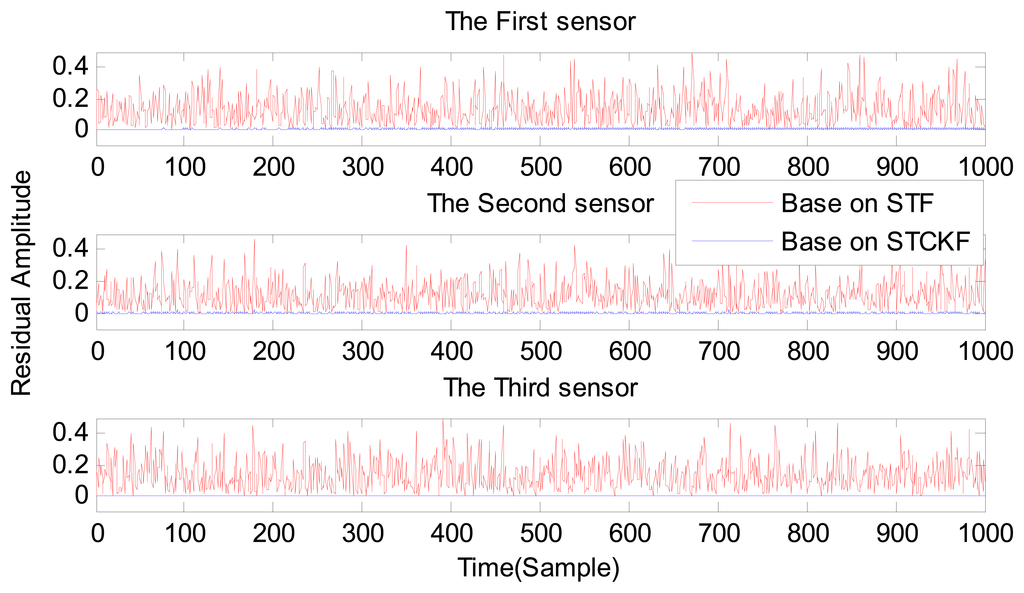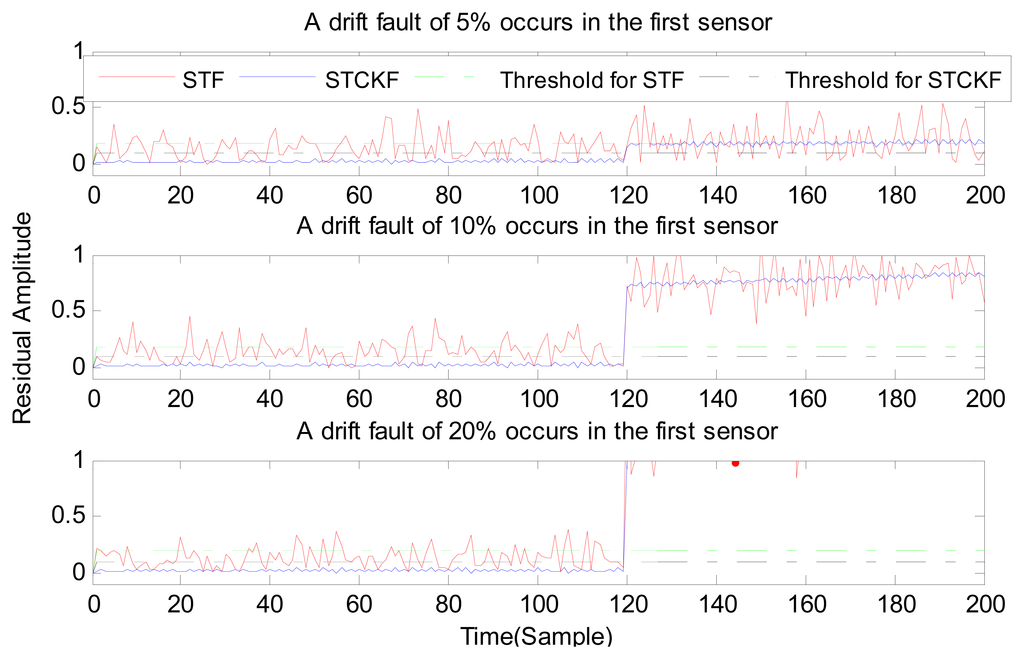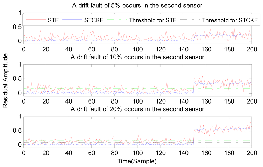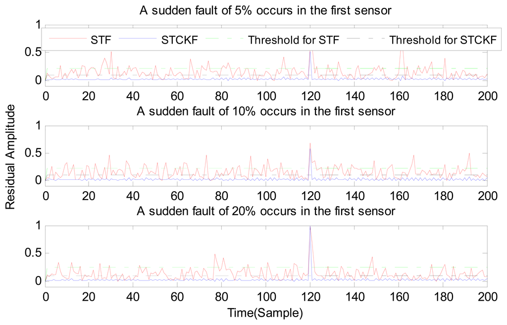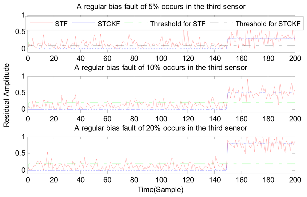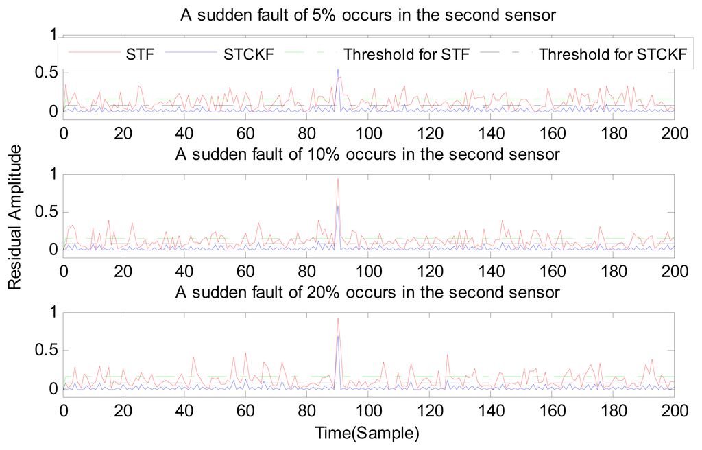Under fault-free conditions, the absolute value of three residuals, obtained through the STCKF, UKF, and STF, respectively, are compared in Figure 2. Comparing the residuals obtained through the three different algorithms, it is evident that STCKF has the highest accuracy. Residuals obtained by STCKF under a fault-free condition are very smooth. The STCKF can reduce rates of false alarms and missed alarms in the fault detection process. Because the constant output failure is very easy to diagnose, we only test the other three types of fault. We verify the effectiveness of the algorithm under three cases of fault. The deviation between the actual output values and the predicted values is greater as the fault level improves. Therefore, greater residual amplitudes are generated and faults will be detected more easily. Our simulation faults deviated 5%, 10%, and 20% from the normal measurements.