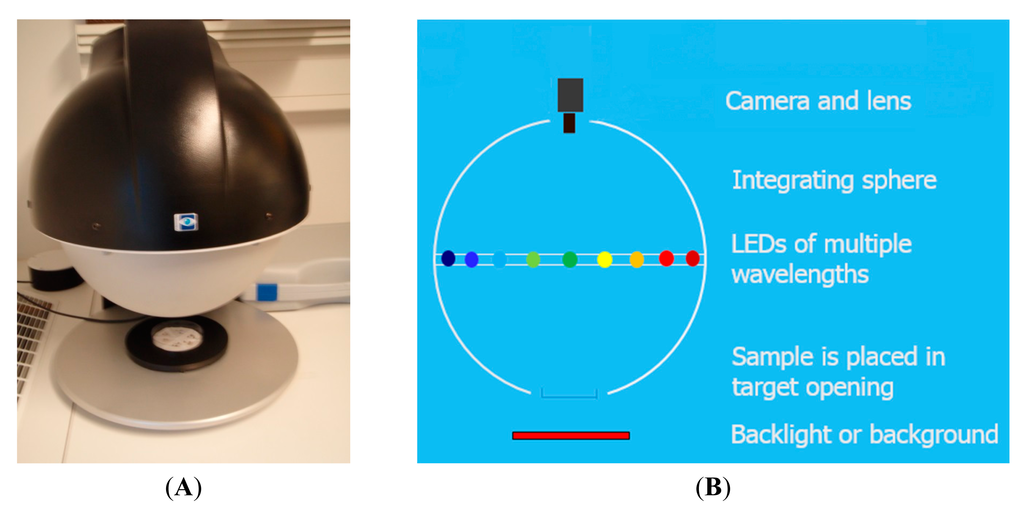 The spectral imaging system used in this research is a VideometerLab instrument (Videometer A/S). It consists of a 5 mega pixel CCD camera, mounted inside the top of an integrating sphere, coated with highly white and diffusing paint and illumination by narrowband high-power LED (light-emitting diodes) placed at the rim, and thereby ensure a uniform and diffuse illumination of the sample at the bottom port of the sphere reflection (Figure 1). The LED's provide light in succession (sequential strobes) at the following 19 wavelengths: 375, 405, 435, 450, 470, 505, 525, 570, 590, 630, 645, 660, 700, 780, 850, 870, 890, 940 and 970 (and backlight at 625 nm beneath the sample holder). Before capturing images the instrument is calibrated to absolute reflectance using a bright and dark reference object (NIST traceable targets), and geometrically aligned using dotted plate. The seed sample is placed at the bottom of the integrating sphere and within 5–10 s a high-resolution multispectral image of 2056 × 2056 pixels were captured. The technology behind the system has originally been developed at the Technical University of Denmark and is described in details in a patent from 2006 [19].