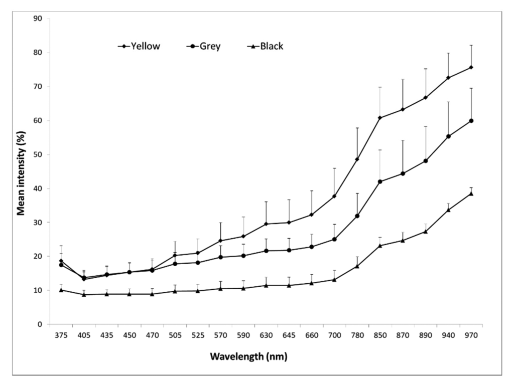 The spectra in Figure 3 show the reflection for the three seed classes and from which it can be observed that in the wavelength from 375–470 nm the yellow and grey seeds are alike, but differ when higher wavelength number are employed. The black seeds have lower reflection intensity in comparison to both the yellow and grey seeds in all 19 wavelengths. Statistical analysis based on reflection data from all wavelengths show that the three classes differ significantly. The standard deviation within the classes of black seeds is lower than the variation within the yellow and grey seed classes.