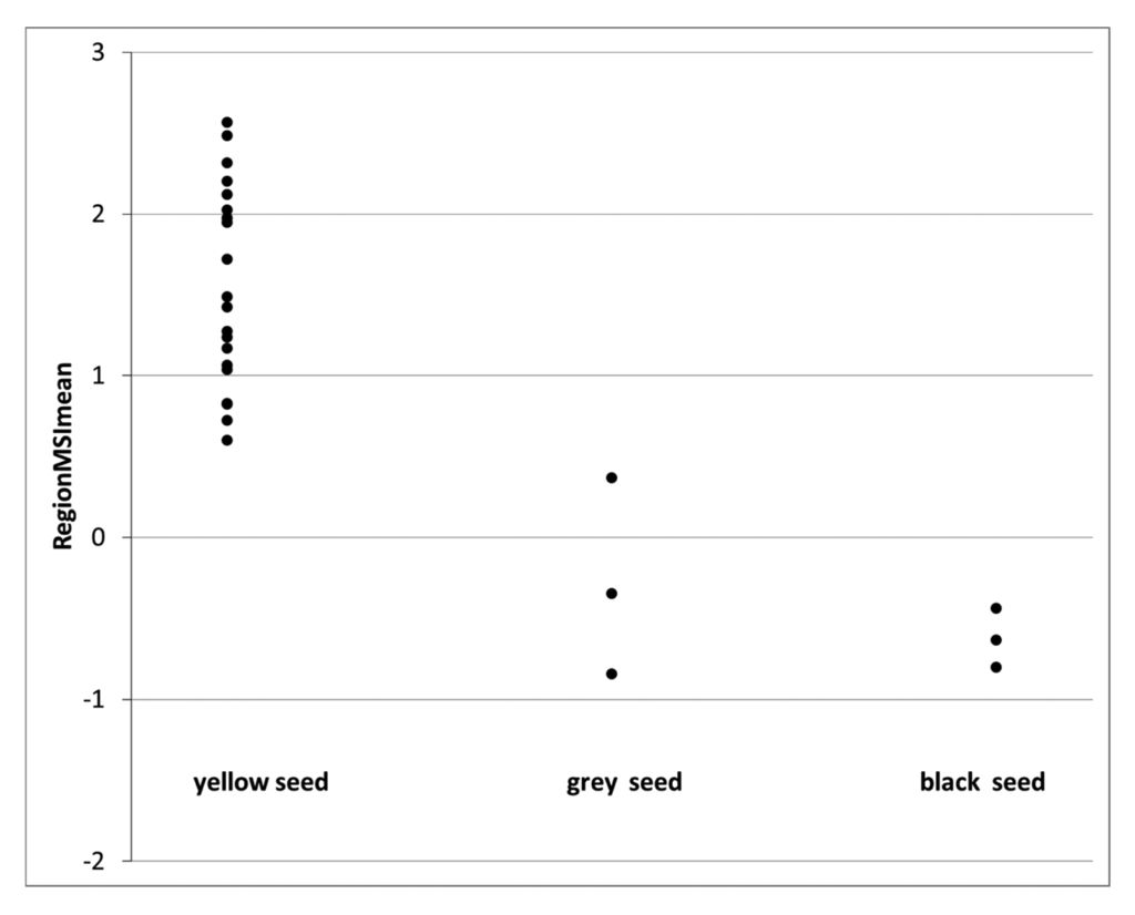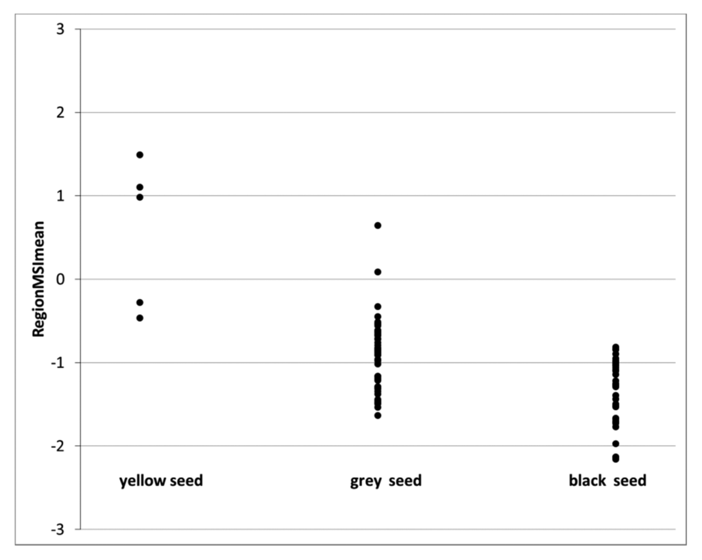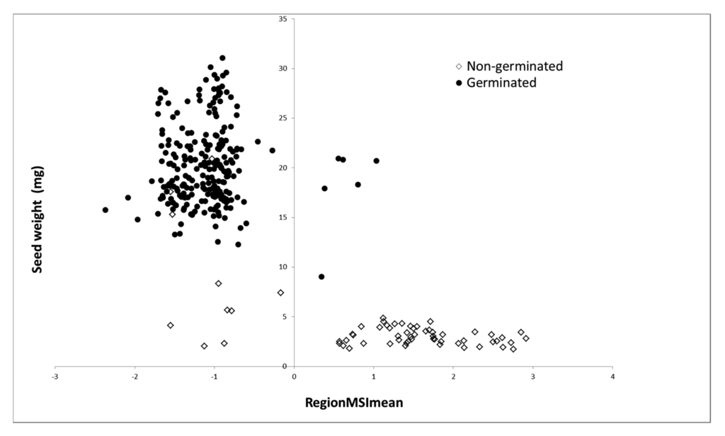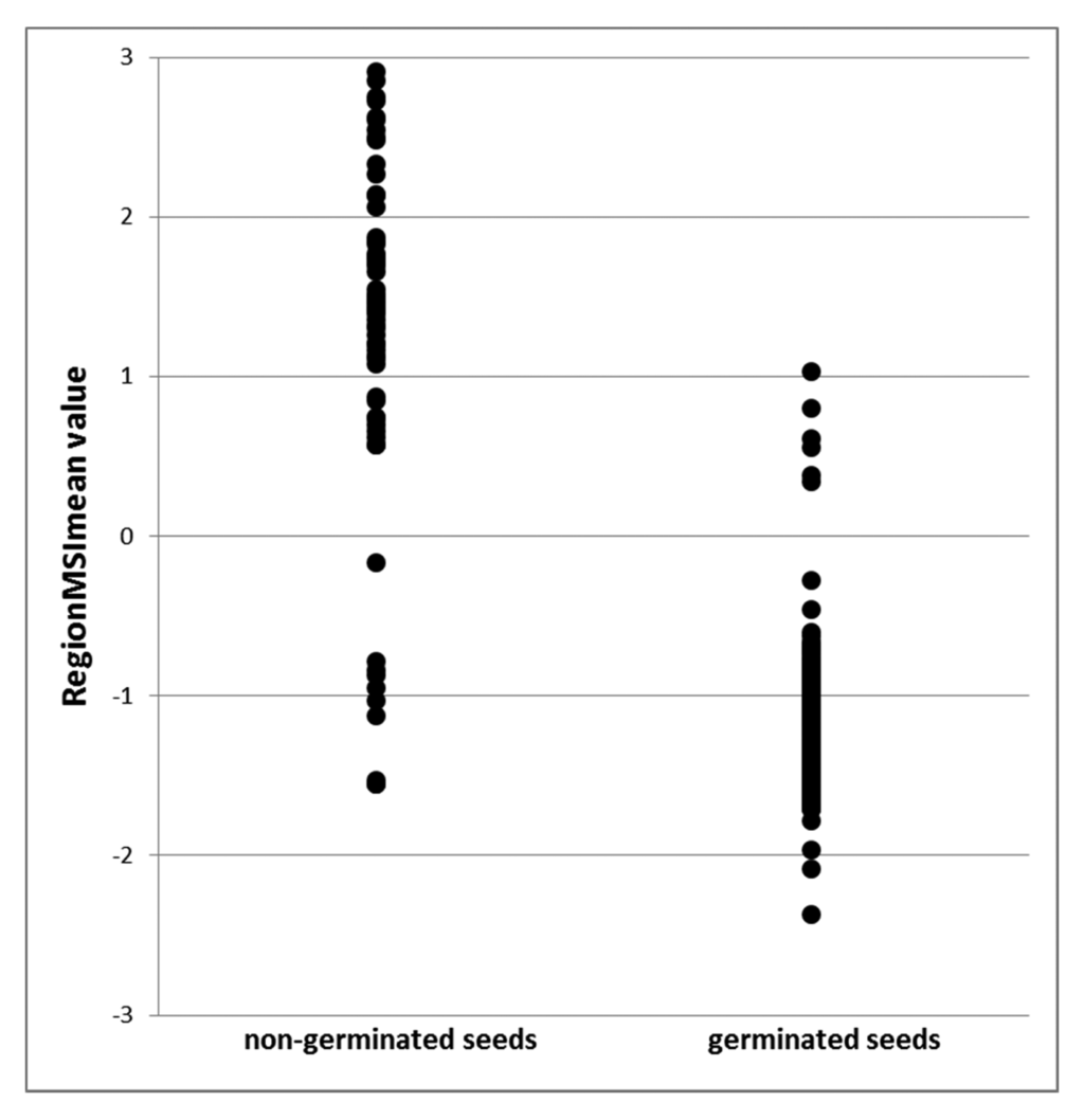 In previous studies seed filling and thus seed weight has been mentioned as a predictor for maturity and germination capacity [6]. Severino and Auld [5] found that castor seeds below 0.16 g had an average germination percentage of 0.1%. Similar result is obtained in our studies, where most of the tested seeds below 0.15 g did not germinate after 14 days of germination. In our study germinating seeds ranged from 0.1–0.35 g, which was considered as low weight in the above mentioned studies where the seed weight were up to 0.90 g. The difference in seed weight between the two studies can be due to different ecotypes or dry matter percentage of the seed samples, at the time of measuring. The correlation between seed coat colour and germination capacity can be due to the different maturity stages at the time of seed harvest. It was observed in Figure 8 that most of the seeds with a low weight also display a positive RegionMSImean (yellow immature seeds). The use of seed coat colour as a marker for maturity has also been proven in other species. The epidermis layer of Arabidopsis seed coat contains phenol compounds, which is colourless until last stage of development, where it becomes dark brown [20,21]. In Brassica species the chlorophyll content in testa is degraded during maturation [22]. In our study we highlighted that five of the yellow seeds were viable and six of the grey/black seed were dead, which indicate that a more detailed subdivision of the seeds might be needed. Greenwood and Bewley [23] have proposed three major physiological periods of seed development of castor bean: (1) the period of rapid fresh weight; (2) the period of dry weight gain and (3) the period of maturation. These three periods may be distinguished by testa colour alone. In their study they have further subdivided each period into several stages and highlight that these cannot be distinguished using a single morphological trait. Depending on the development stage the seeds may also exhibit primary dormancy [24]. During storage deterioration and membrane damage might occur and biochemical changes have been determined in earlier studies [25,26]. This adds to the explanation of why ten seed were classified as viable, but failed to germinate (Table 3). Thus, a combination of our analysis with technologies providing information from inside the seed, like X-ray, NIR or infrared reflection (IR) would be valuable.