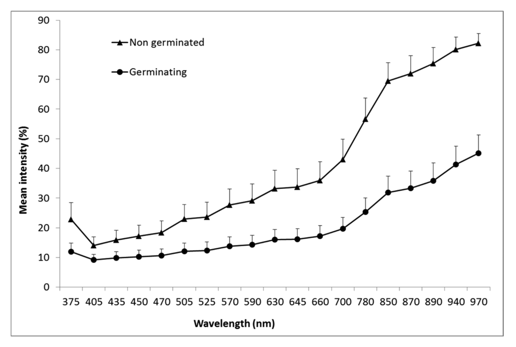Multispectral imaging is an emerging non-destructive technology in seed science, which integrates the conventional vision and spectroscopy technique to attain both spatial and spectral information from the target objects simultaneously. Multispectral imaging requires no sample pre-treatments, making it more suited for process monitoring and quality control. More importantly, this technique has a great potential to measure the multiple components by reflection from both visual (visual colour compounds) and near-infrared wavelengths (non-visual chemical compounds) at the same time for quality assurance. Vision and spectral technologies have shown promising results in different aspects of determing seed quality features such as fungal infection and germination in spinach [11–13] fungal infection in corn [14] and seed purity in rice [15,16].