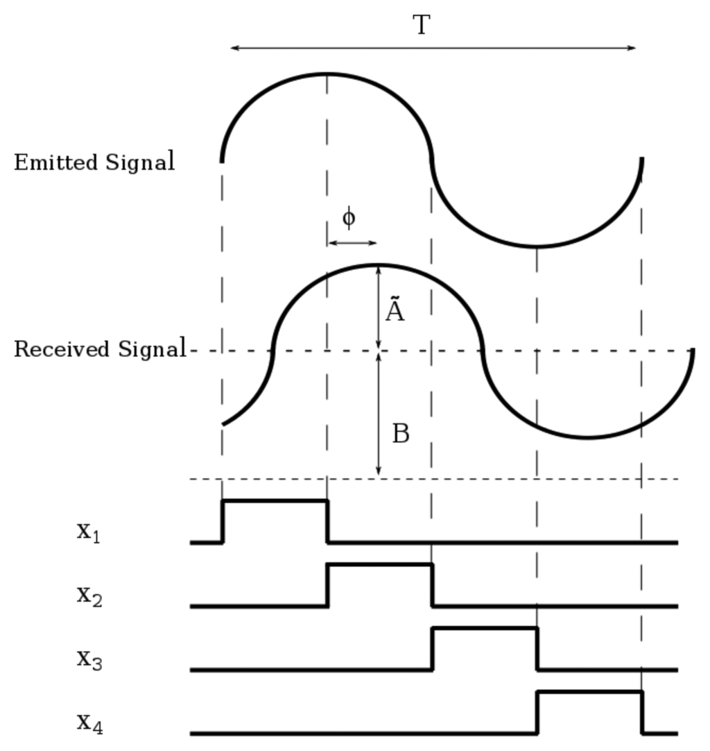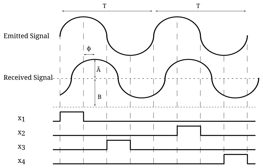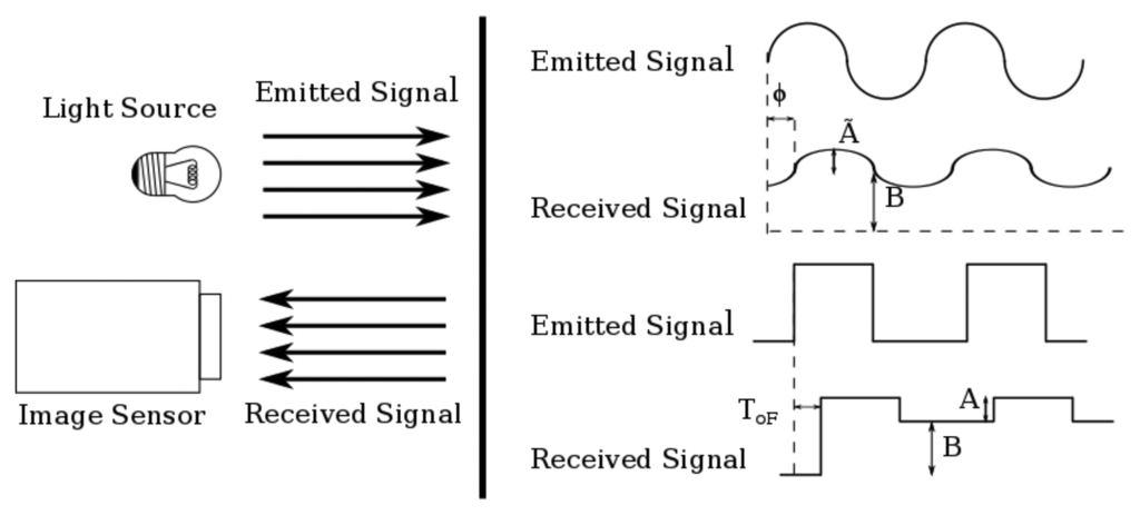 In the modulated ToF operation the emitted signal is a continuous-wave signal modulated in time, usually a sinusoid. The phase difference between the emitted and received light signals, ϕ, depends on the distance traveled by the light, from the sensor to the object and back again. The separation between the sensor and the object can be calculated as: