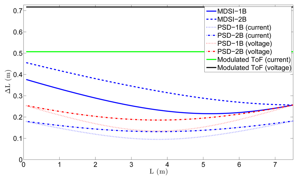 The errors in the distance measurement in the situations depicted in Figure 8a,b are too high for most applications. There exist four ways of reducing these values. The first one is to increase the light power of the pulse; however, this will violate eye safety regulations. The second option is to use larger photosensors, as increasing the photosensor area by a factor of four reduces the shot noise uncertainty by two, but larger photosensors have slower responses. The third option is to increase the integration time of the sensor with a fixed T, which increases Nacc and, hence, reduces ΔL by a factor . Alternatively, for pulsed ToF, increasing the integration time permits one to increase T and, thus, A, which reduces the distance uncertainty as . Finally, the last option is to minimize the background light reaching the pixel, which, in practice, is usually accomplished by placing optical filters in front of the sensor that restrict the incident light to the wavelength of the light source. The same situation as in Figure 8b, but without background noise (B = 0), is shown in Figure 9. This represents the minimum achievable error of the ToF sensor. In the ideal situation of no background light, the modulated ToF technique does not have shot noise error, and there is no difference between the 1B and 2B measurement techniques.