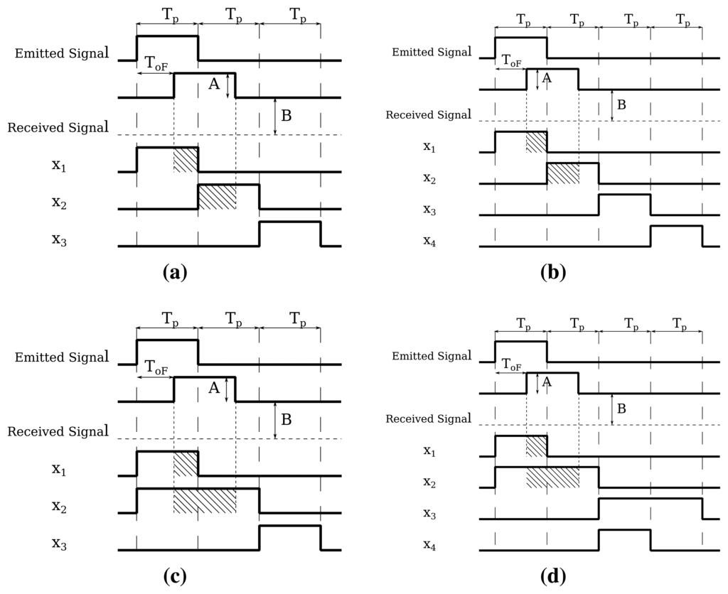 Pulsed ToF employs square wave signals. The time delay between the emitted and received light pulses, ToF, depends on the distance traveled by the light, which can be calculated as: