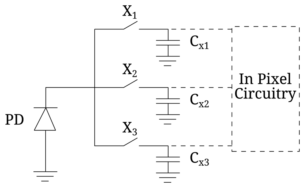 The actual number and size of the capacitors depend on the measuring technique. Both modulated and 2B-pulsed techniques need only two capacitors, whereas 1B-pulsed techniques need three. Besides, since 1B techniques accumulate A and B, such capacitors are bigger, too. Therefore, the 1B approach will lead to smaller shot noise, but at the cost of bigger pixels with a smaller fill factor.
