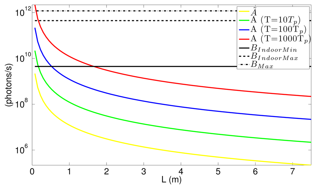 Three different ambient light illuminations were studied: a poorly-illuminated indoor scenario, with a background light power density of p̄BIndoorMin = 6.25 × 10−4 W/cm2; a well-illuminated indoor scenario with p̄BIndoorMax = 6.25 × 10−2 W/cm2; and outdoor illumination in midsummer with p̄BMax = 0.167 W/cm2. This background is comprised of light of different wavelengths, but for the calculation of B using Equation (26), λ = 630 nm was used, since around this wavelength, the silicon has higher sensitivity. The obtained values are: BIndoorMin = 4.46 × 109, BIndoorMax = 4.46 × 1011 and BMax = 1.19 × 1012 photons per second. Assuming that the eye safety regulations are satisfied for every distance to the sensor greater than 10 cm, the light power per unit area impinging the sensor at this distance is around p̄pix(10 cm)= 130 μW/cm2. In this calculation, we set ρ = 0.5, θ = 40°, τopt = 1 and F# = 1.4. From this, and using Equations (21) and (24), the maximum value of A as a function of the distance between the sensor and the target can be calculated; Figure 7. As can be seen, in modulated ToF techniques, Ã is severely reduced for longer distances, which, in turn, results in a higher shot noise. On the other hand, in pulsed ToF, the value of A depends on T through ppulse. Longer T values result in higher A, due to the fact that by increasing T, it is possible to increase the light power of the pulse without increasing the average light power, as seen in Equation (23). It should also be noted that in modulated ToF, the number of photons reaching the sensor because of the background is bigger than those from the signal in all of the background situations. In pulsed ToF, even with large T values, the situation is only reversed for distances lower than 2 m.