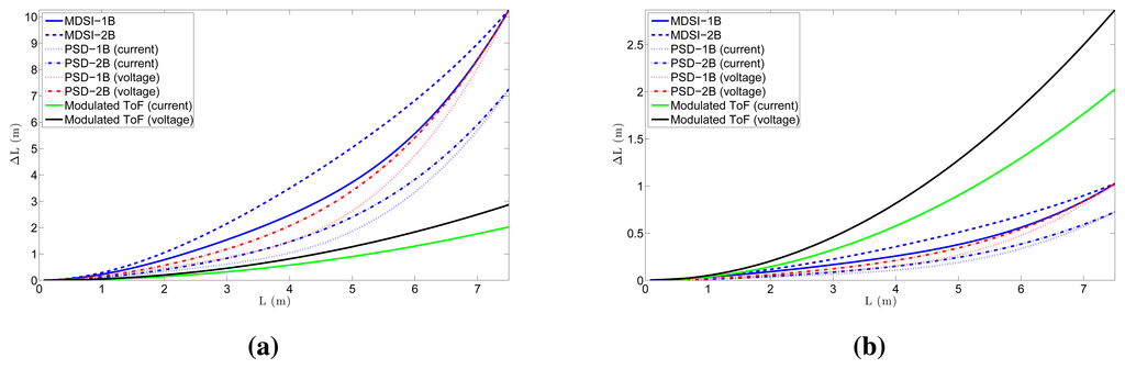 With these values, the distance error due to shot noise can be calculated. Figure 8a,b shows the distance error due to the shot noise for all of the different ToF techniques for BIndoorMin. Values of T =0.5 μs (10Tp) and T =50 μs (1000Tp) were used for the pulsed-ToF techniques, respectively, whereas T = 50 ns was used for modulated ToF. By comparing both figures, the fact that the shot noise in pulsed ToF is reduced with larger T is apparent, despite the fact that the number of accumulations is reduced. The reason for this is that, as seen in Equation (23), increasing T results in larger instant light power for a given value of p̄pix, which is usually limited by eye safety constraints. It can also be seen that, because of the reduction of à and A for greater distances, the shot noise and, thus, the accuracy worsen with the distance. In addition, a comparison between ToF techniques can be performed. First of all, for the same ToF technique, the current mode always presents less error due to shot noise than the voltage one, except in the MDSI case, where they are the same. The reason for this can be inferred from Table 2. The number of accumulations in both modulated and PSD ToF for a given integration time in the current mode is twice the number as in the voltage one, because, in the latter, two light pulses per measurement are needed. The MDSI technique needs two light pulses per measurement in both modes, so that the shot noise does not change. In addition, by comparing PSD and MDSI, it can be seen that the first one is better, as it requires less light pulses per measurement. Finally, for the same technique, 1B measurements present lower shot noise than 2B measurements.