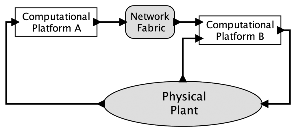 Consider a simple CPS depicted in Figure 1. Here, two embedded computers interact with a physical plant through sensors and actuators and with each other through a network fabric. Suppose that the physical plant is modeled with an ODE and that the computations are modeled with single-threaded imperative programs. Each of these models is deterministic, but the combination is not. The behavior of an ODE is strongly affected by the timing of its external stimuli, but a program provides at best only very weak ways to control that timing. Worse, even those weak mechanisms are rarely part of the semantics of the programming language, so the program, viewed as a model, actually expresses nothing at all about timing.