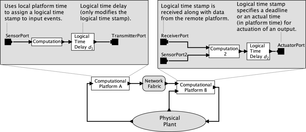 Notice that platform A will send a message over the network in response to receiving sensor data on SensorPort. Suppose the sensor data has time stamp τ, the local platform time at which the sensor measurement is taken. The sensor data will be processed by the box labeled Computation. Assume that that box produces an output event with the same time stamp τ. The second box on platform A is labeled “Logical Time Delay d1.” What that box does is simply pass its input event to its output, but with the time stamp τ replaced with time stamp τ + d1. Hence, the ReceiverPort will receive a message with time stamp τ + d1. When will it receive the message?