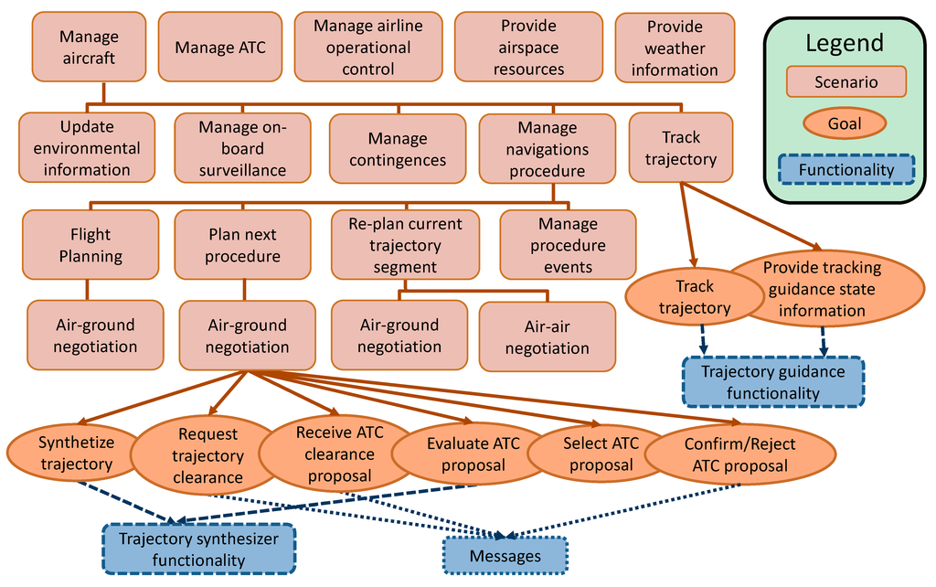 For above scenarios architecture, several functionalities can finally be identified. As was explained, a practical way to recognize these functionalities consists of associating specific goals to each scenario. Then, as it is shown in Figure 3, main aircraft functionalities related to a trajectory can be recognized from lowest level scenarios goals. Some of these functionalities are as follows: trajectory prediction, trajectory conflict detection, trajectory performance evaluation, trajectory tracking, etc. In addition, other functionalities are also required for managing inter-agent communication messages.